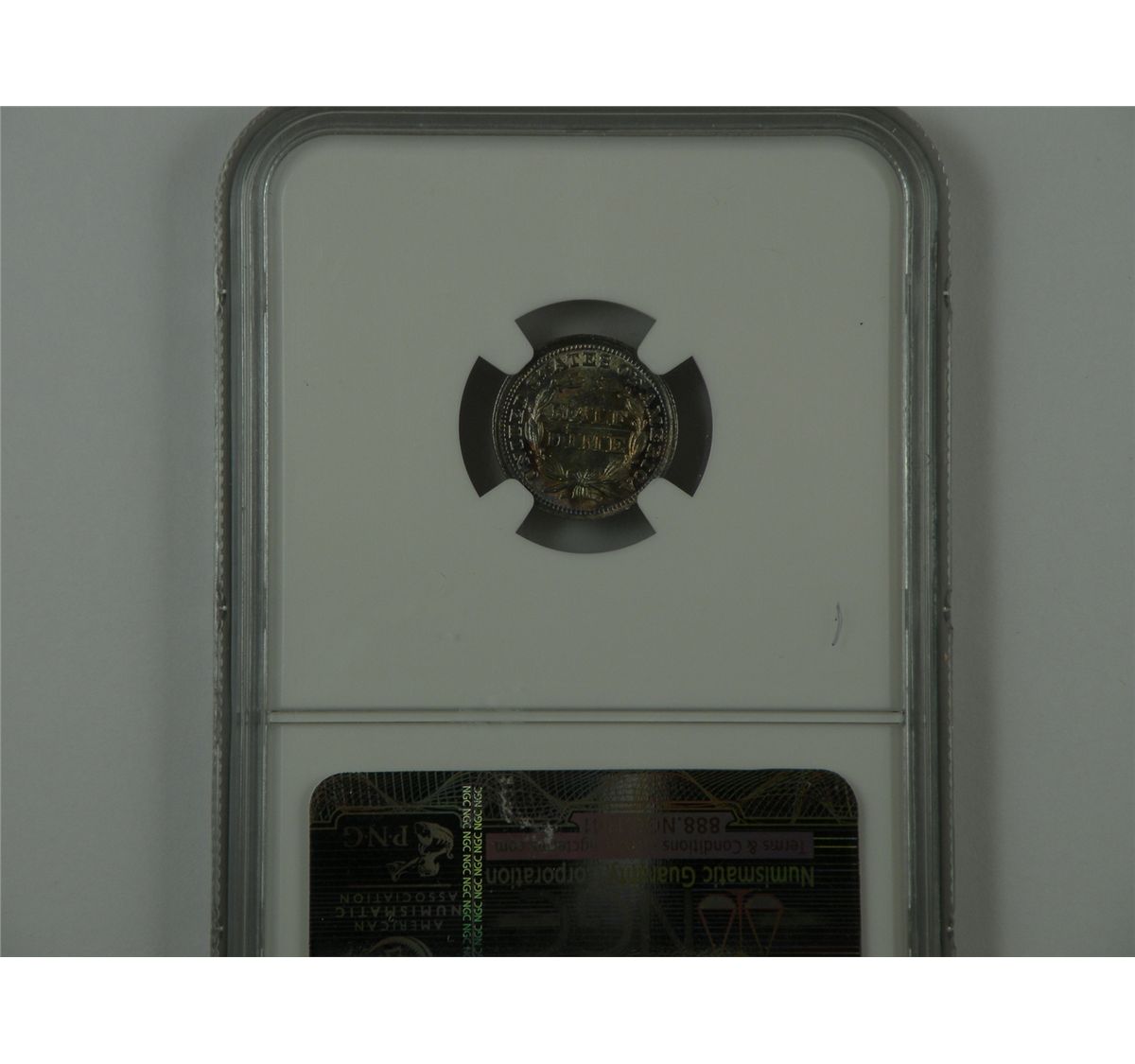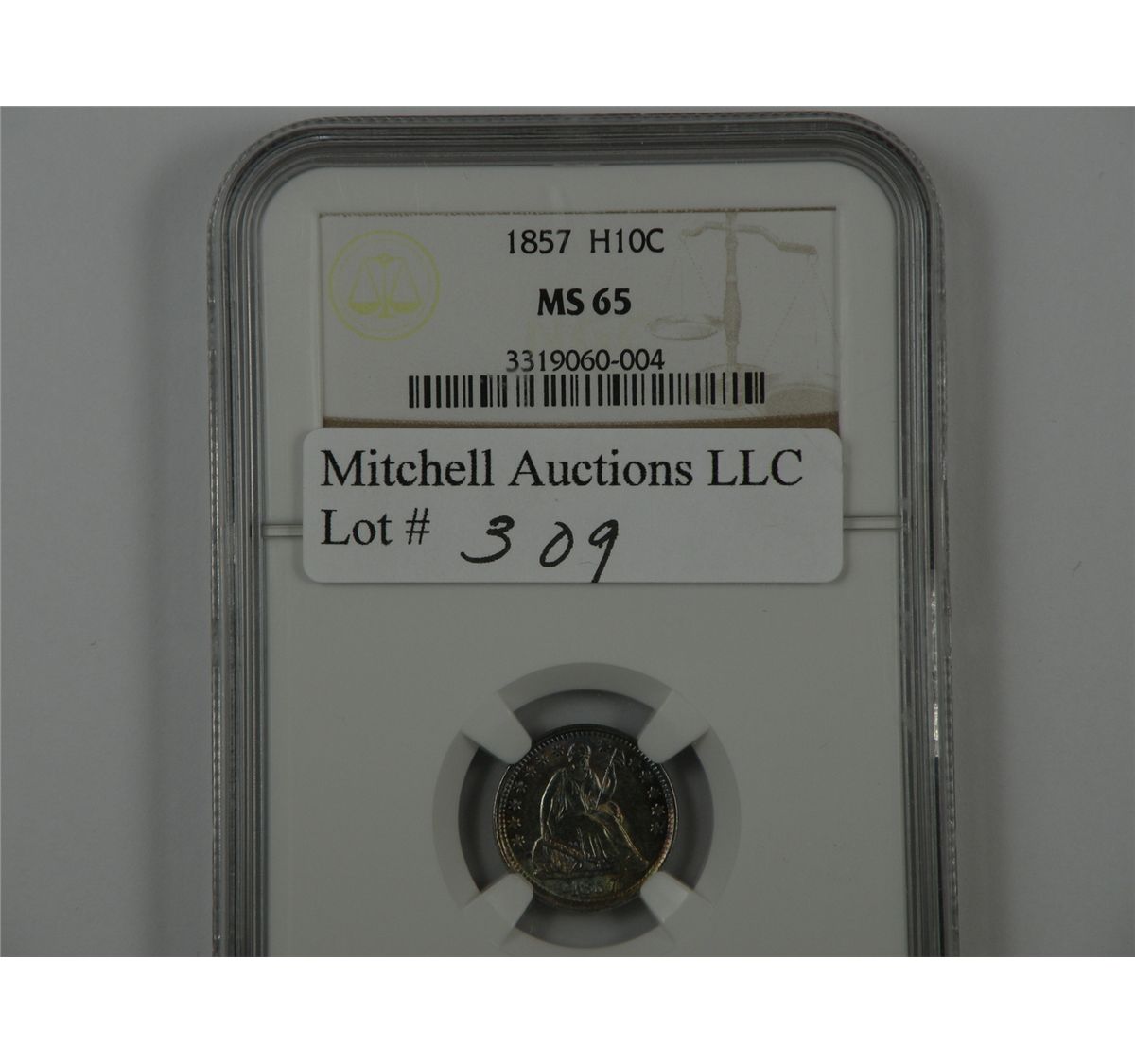 1/2 Dime 1857 NGC MS65 and a multicolored beauty. Pastel iridescent shades of green, rose, lilac, and gold immerse both sides of this compelling jewel. Worthy of a significant premium, as the coloration is magnificent. Est.$800