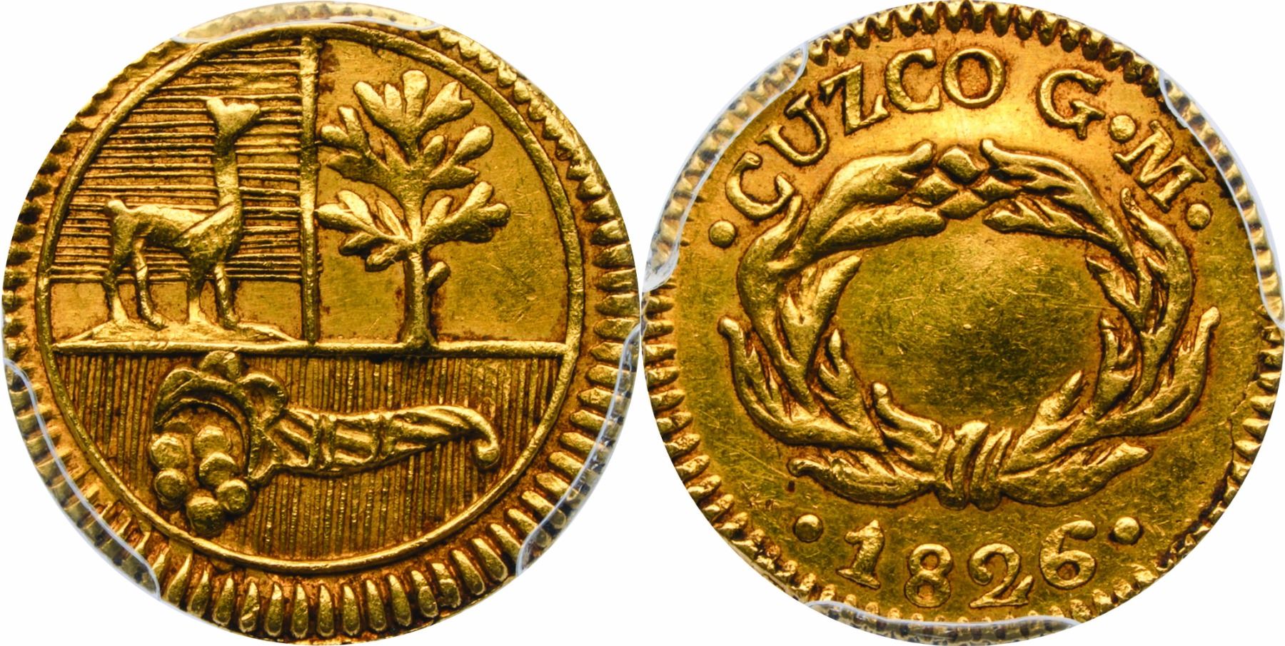 1/2 Escudo, Cuzco, 1826 NG M, AU 1.69 g. Ref : Fr. 60, KM#146 Grading : PCGS AU 58 Conservation : pr