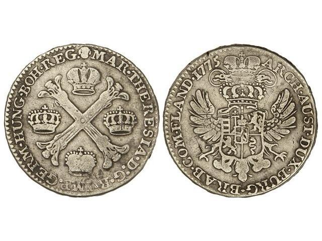 1/2 Kronenthaler. 1775. Mª TERESA. PAÍSES BAJOS AUSTRÍACOS. AR. (Golpecitos y rayitas). KM-19. MBC-.