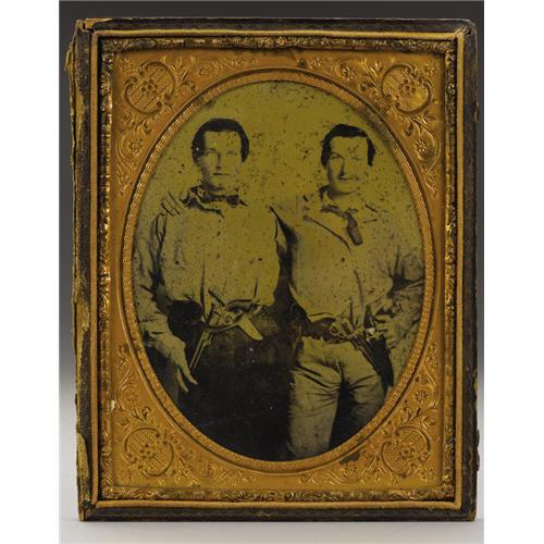 <B>Fascinating Half-Plate Daguerreotype of Confederate Colonel James F. Caldwell and his Brother, Lieutenant Robert D. Caldwell, Jr.</B></I> Four sons of Colonel Robert D. Caldwell of Paris, Tennessee went to war in 1861. Only one, Confederate Surgeon Major Samuel Houston Caldwell survived it. According to Goodspeed's Biography of Henry County Tennessee, the father of the young men owned much land in the state of Texas where two of his sons, James F. Caldwell and Robert D. Caldwell, had gone to settle. When war came in 1861 the young men joined the Confederate Army; the elder James F. Caldwell joining the Polignac Texas Brigade, the younger Robert D. Caldwell, Jr. signing up with the 9th Regiment of Mississippi Cavalry. <BR><BR>Shown in this half-plate daguerreotype are Robert D. Caldwell at left, later a lieutenant in the 9th Mississippi Cavalry and his older brother James F. Caldwell who would rise to rank of colonel of Polignac's Brigade in Texas led by Prince Camille Polignac a French-born Confederate general. This photograph was taken at the start of the war at Waco, Texas and dramatically shows each man dressed in battle shirts and armed with revolvers and side knives. <BR><BR>Robert D. Caldwell (1842-1865) became ill while fighting with the 9th Mississippi Cavalry and was taken back home to Paris, Tennessee where he later died, but not before being commissioned a lieutenant. Colonel James F. Caldwell, 1834-1865, was made chief of commissary for General Polignac and fought through the war until falling ill himself at the end of the war and dying of disease contracted through the protracted campaigns in Louisiana. <BR><BR>One of their brothers had already fallen in battle. Captain Anthony Wayne Caldwell of the 5th Tennessee Infantry had been wounded in the hand at the Battle of Atlanta. In what was a common occurrence during the Civil War, Captain Caldwell's wounds would have not been fatal but not for the infection that set in days later. As noted in Confederate Lieutenant Edwin Rennolds' book, <I>A History of the Henry County Commands,</B></I> published after the war, fever set in his wounds and he died soon thereafter. Rennolds also recounts the deaths of James F. and Robert D. Caldwell, the subjects of this dynamic photograph we have here. <BR><BR>The Tennessee State Historical Commission has a letter from Captain Anthony Wayne Caldwell to his father dated July 14, 1863, a year before his death at Atlanta where he mentions all three brothers, including Robert's promotion and James' service in the commissary of a brigade. Brother Samuel, the Confederate surgeon is mentioned as well. <BR><BR>The surviving son of Colonel Robert D. Caldwell, Confederate Surgeon Major Samuel Houston Caldwell would return to Paris, Tennessee and be well known as Confederate General Nathan Bedford Forrest's battlefield surgeon. <BR><BR>This large half-plate daguerreotype is an exciting image by itself. Coupled with the history of the soldiers and their family, it is an historic piece as well. In good condition with some spotting, it is in its glass-covered frame with only half the leather case intact.<BR><BR><b>Shipping:</b> Flat Material, Small (<a target="_blank" href="http://www.heritageauctions.com/common/shipping.php">view shipping information</a>)