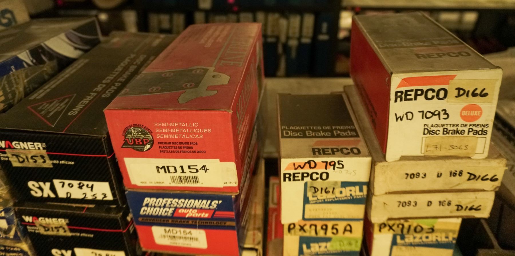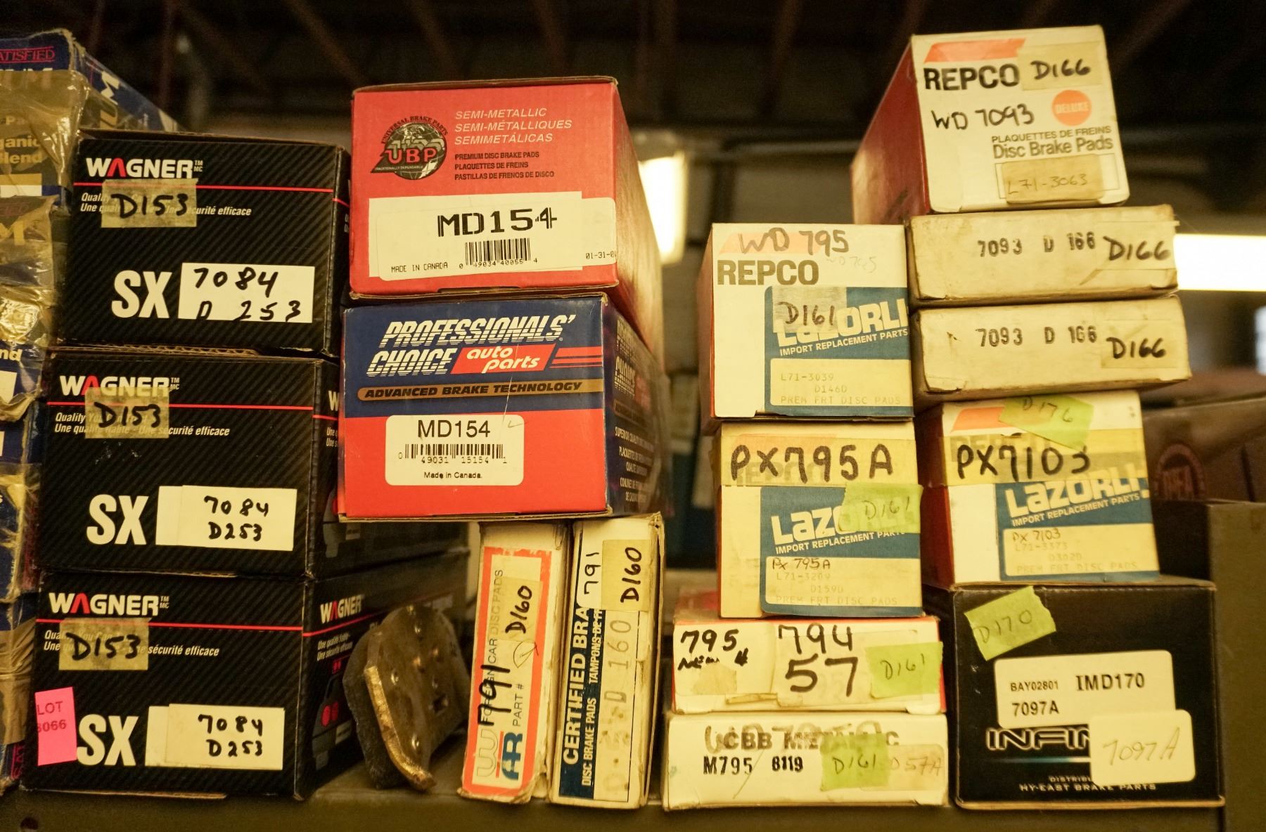 MIXED LOT OF ASSORTED BRAKE PADS AND BRAKE SHOES, VARIOUS SIZES AND PART NUMBERS. SUITABLE FOR DOMESTIC AND IMPORT VEHICLES SPANNING 1960S THROUGH 2000S APPLICATIONS.