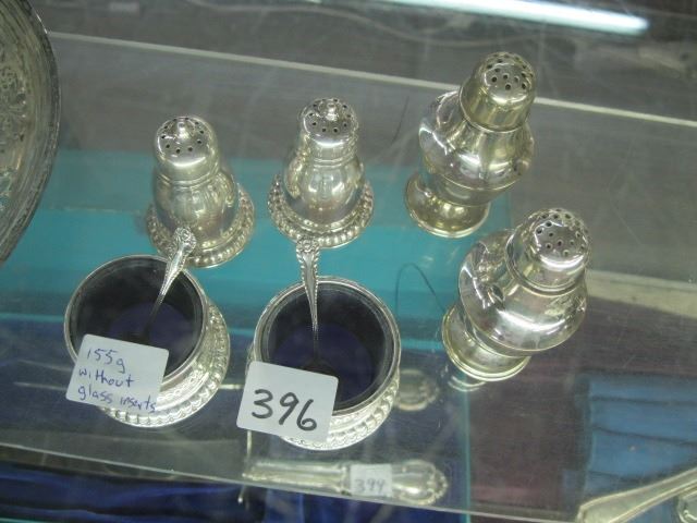 1 2 STERLING SILVER SALT & PEPPER SHAKERS, 2 SUGAR BOWLS WITH SPOONS WEIGH 155 G (WITHOUT GLASS INSE