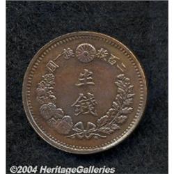 <B>1/2 Sen Meiji 7 (1874),</B></I> JNDA-1.53, KM-Y.16.2, iridescent Unc. with prooflike surfaces and a slightly porous reverse which appears to be as struck. <BR><BR><B>Important notice:</B> Heritage usually auctions material at the rate of 200-250 lots per hour. On some occasions eBay Live bid software or the Internet may not be able to keep up with the pace of the auction. We recommend placing a realistic absentee bid now as insurance to avoid disappointment. Occasionally the auctioneer may eliminate or reject an eBay Live bid, and the auctioneer may also reopen a lot after the close of the eBay live bidding (usually because we missed an audience bid), and may reject your bid even if it shows you as the winning bidder. By bidding via eBay Live, you agree that Heritage may award the lot to another bidder at its sole discretion under the circumstances described above or any other reasonable circumstances. Since eBay bids are not shown to us until we open the lot on the floor, we treat those bids just like floor bids. In most cases the floor responds before the eBay bid is presented to us, due to Internet lag time, so for consistency we have made it a policy that floor bids are always considered first over tie eBay live bids. Also please note that all Heritage lots purchased through eBay Live carry a 20% Buyer's Premium. Please make sure you read the Terms and Conditions before you bid.