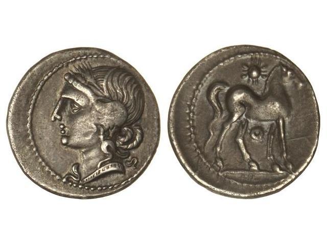 1/2 Shekel. - 220-210 a.C. - ZEUGITANIA. CARTAGO. - Anv.: Cabeza de Tanit a izquierda. Rev.: Caballo parado a derecha, encima disco solar, entre las patas del caballo círculo. 3,80 grs. AR. Pátina. Se-6498 var. MBC+/EBC-. - -