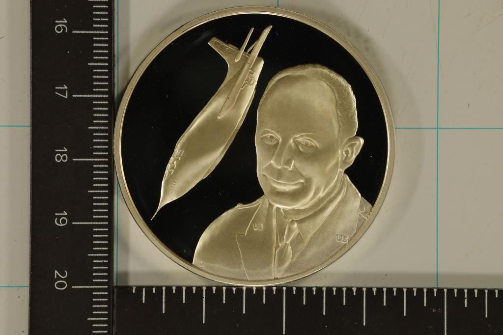 ROUND. "MAJOR CHARLES YEAGER USAF" FIRST SUPERSONIC FLIGHT (BELL X1) 14 OCTOBER 1947. IN HARD PLASTIC CAPSULE.