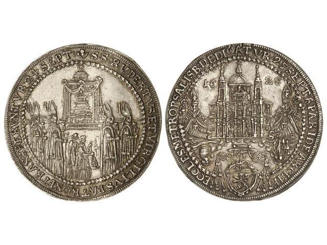 1/2 Thaler. 1628. SALZBURGO. AR. Consagración Catedral. París von Lodron. (Rayitas en canto a las 12 horas). KM-141. EBC+.