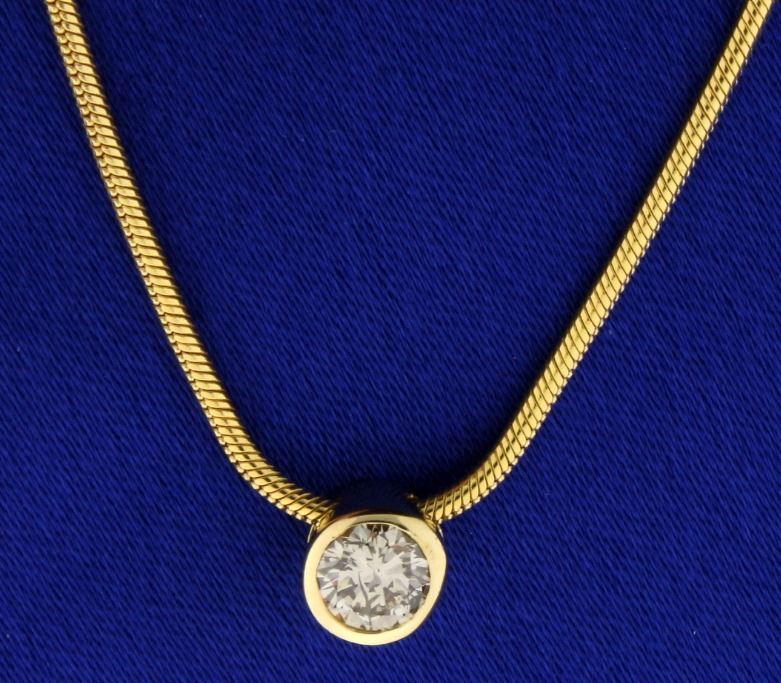 In 14k yellow gold. 18" snake chain with lobster clasp. 1/4" pendant. Contains a high quality 1/2 ct round diamond, I clarity/J color. 8.1g.