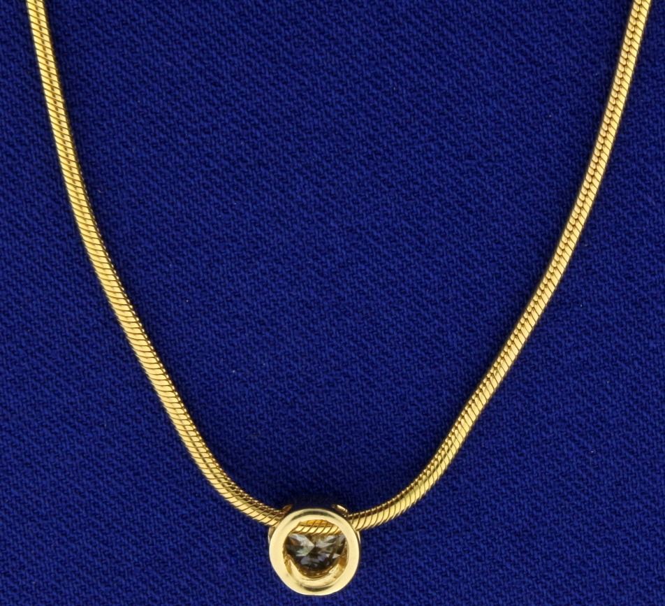 In 14k yellow gold. 18" snake chain with lobster clasp. 1/4" pendant. Contains a high quality 1/2 ct round diamond, I clarity/J color. 8.1g.