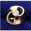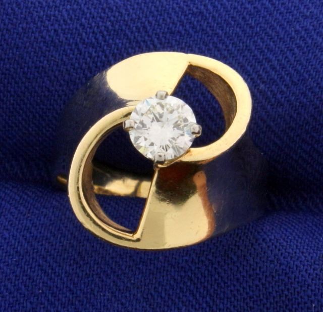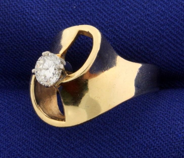 In 14K yellow gold. Contains a 1/2 ct High Quality Round Brilliant Diamond, SI-1 clarity, G color. Diamond has great sparkle and is completely eye clean. Unique design. Size 5 1/2. 5.2g