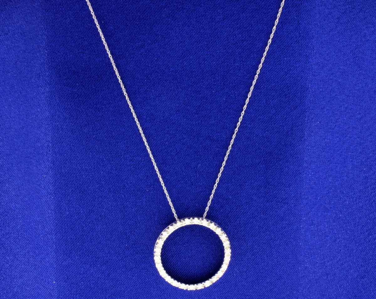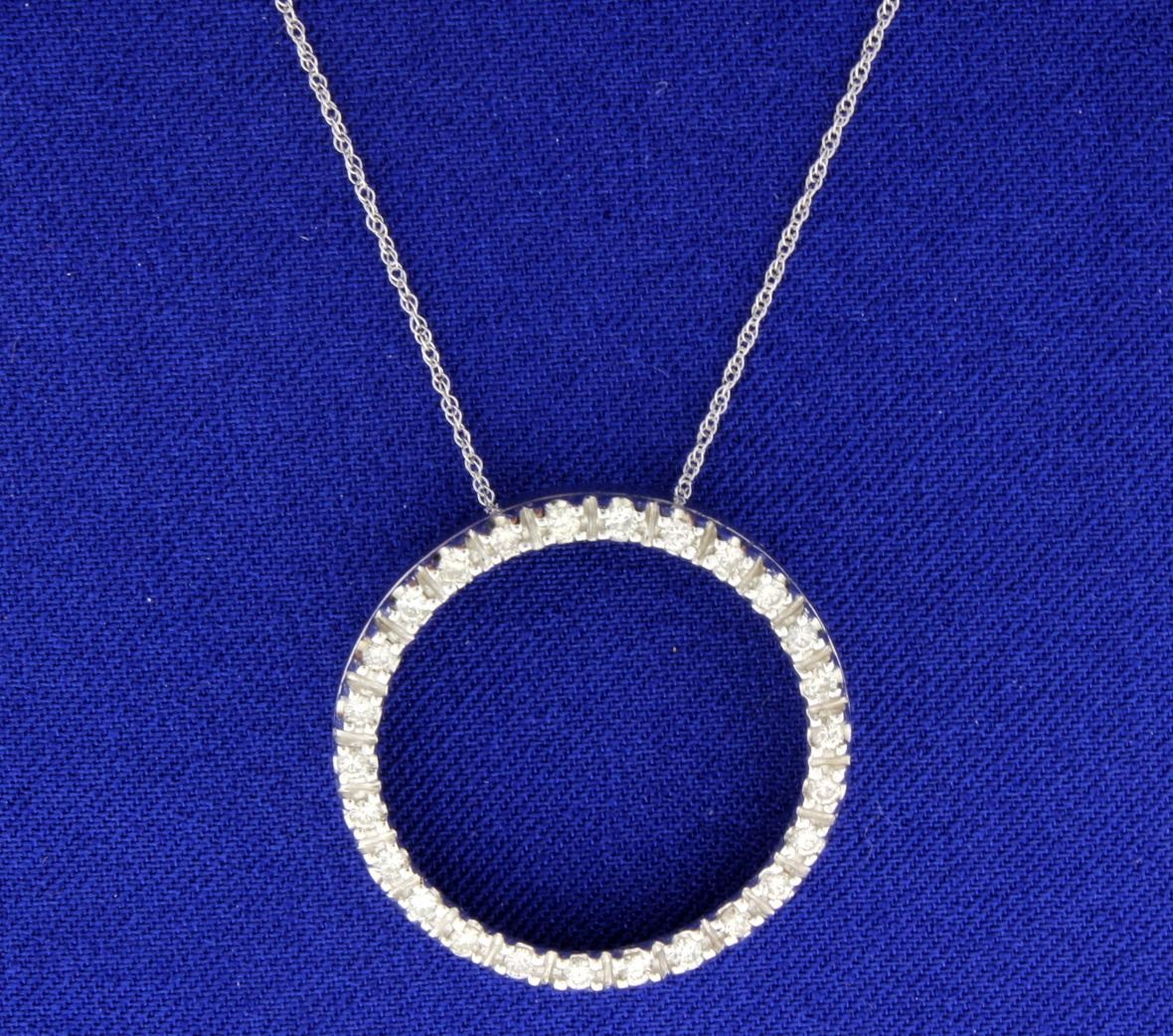 In 14k white gold this pendant has 1/2ct TW of round diamonds. SI-I1 clarity/ I-J color. Pendant is 1inch diameter. Comes with 18 inch 14k white gold chain. 4.2g