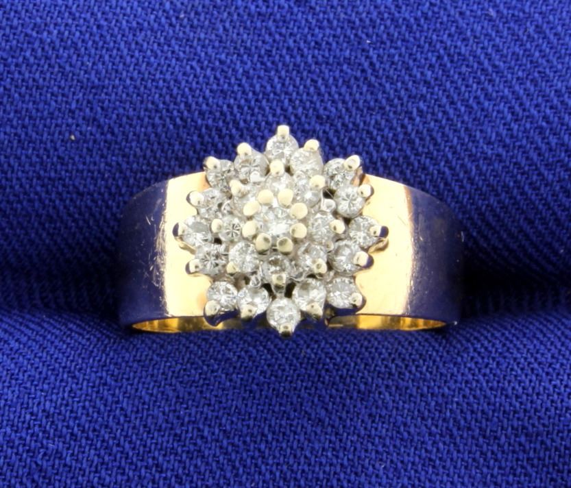 In 14K yellow and white gold, the center is .1ct surrounded by eight .01ct and sixteen .02ct high quality round diamonds - SI clarity/H Color. Size 6 1/4 5.0g