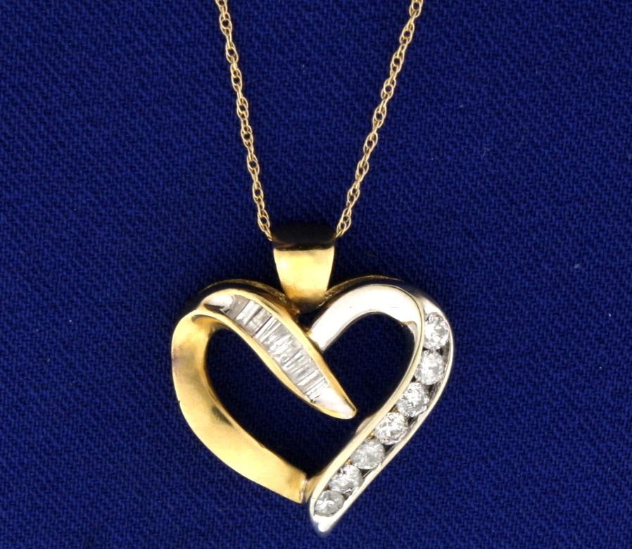 In 10k white and yellow gold. Contains 7 high quality brilliant cut round diamonds, H color, I clarity. Also contains 10 high quality baguette diamonds, H color, I clarity. Pendant is 7/8 inches long and yellow gold chain is 18 inches long. 2.9g