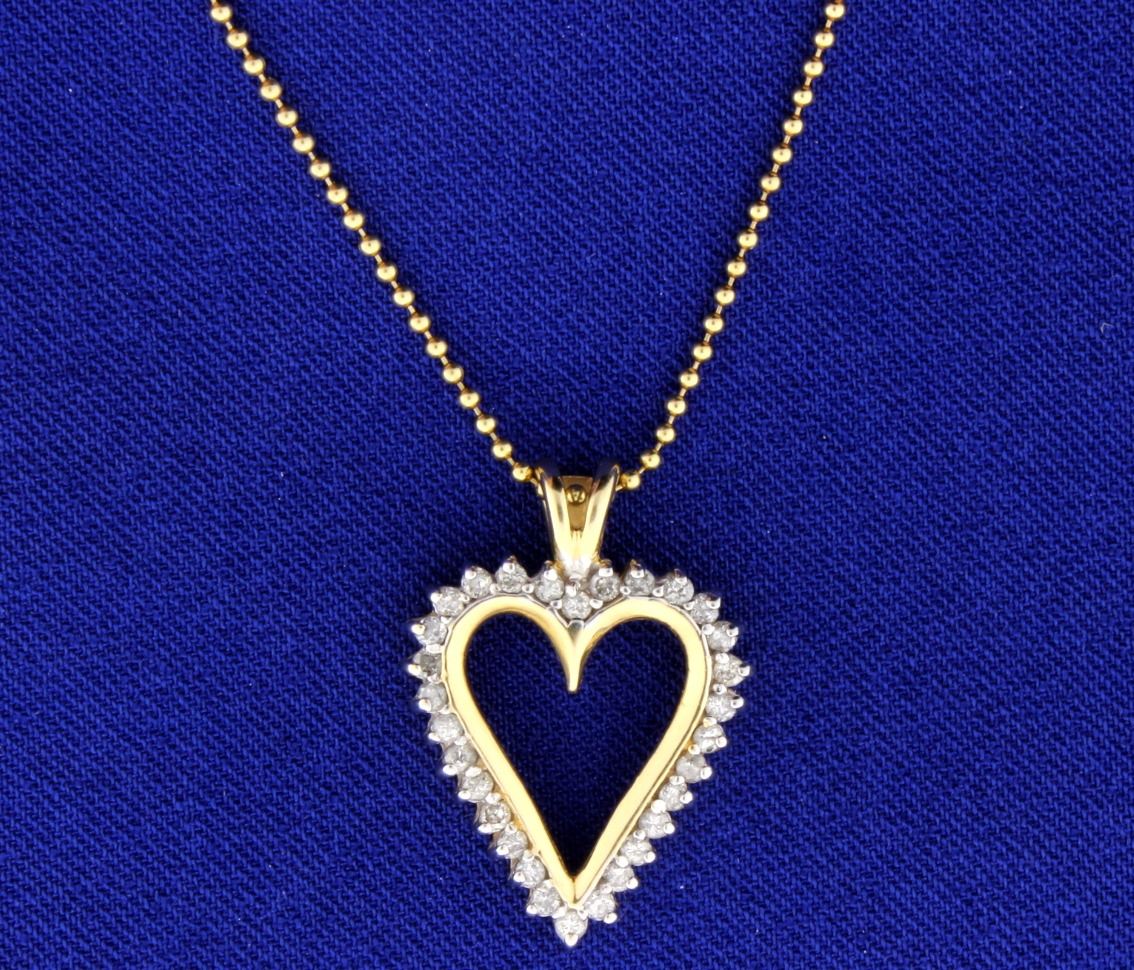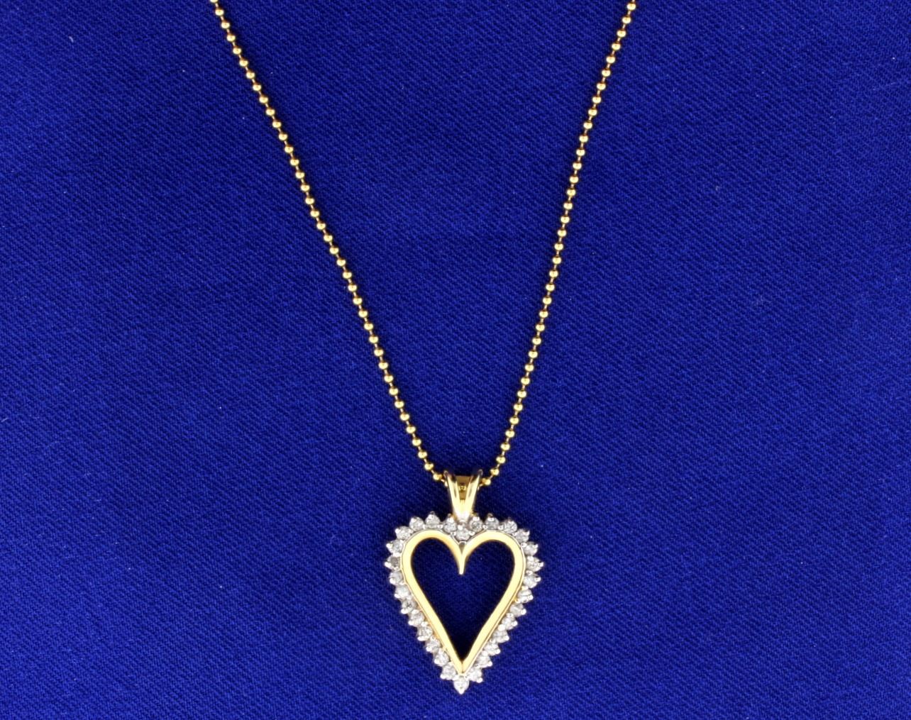In 14k yellow gold. This heart shaped pendant has 1/2ct of diamonds with a bead style 19 inch chain. Diamonds are SI clarity/ I-J color. 6.1g