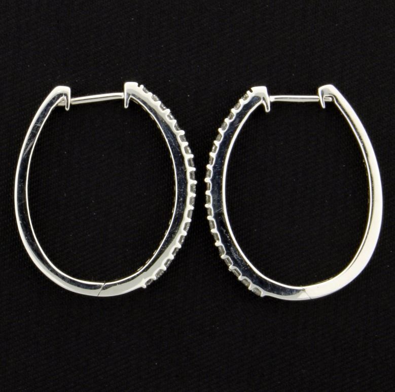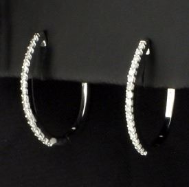 In 10K white gold, they are 3/4 inch long. Each earring contains eighteen high quality round diamonds. 2.6g
