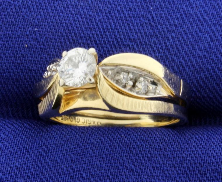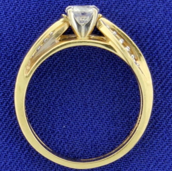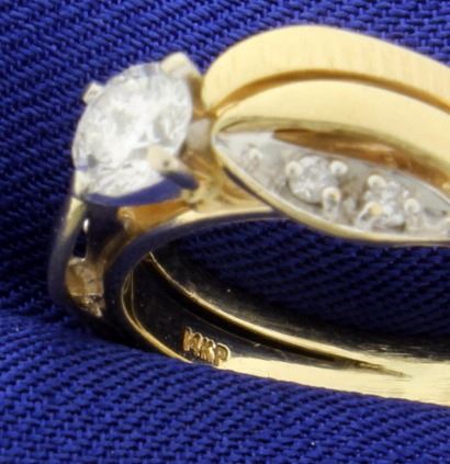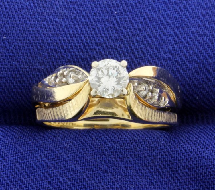 In 14K yellow gold, the center is a very high quality .42ct round diamond - F color/SI clarity, completely eye clean. With two .02ct round diamonds on either side. Size 6 1/4 5.1g