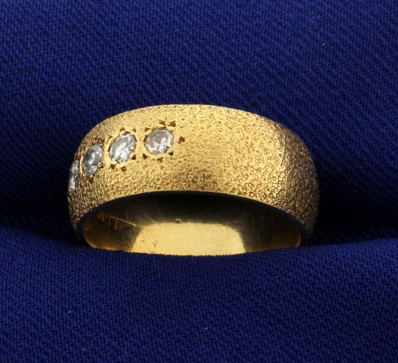 In 14k yellow gold, containing five high quality 0.1ct diamonds with H color/SI clarity. Size 7. 7.5mm wide. 6.8g.