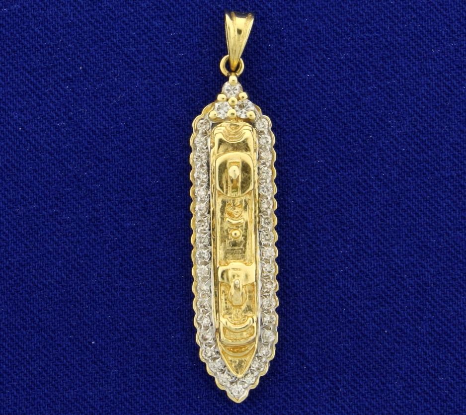In 14k yellow gold. Containing three .03ct and thirty five .015ct high quality diamonds, SI clarity/G color. 1 3/4" long with bale. 6.0g.