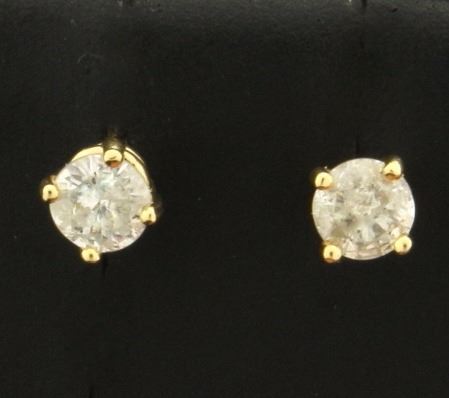 In 14k yellow gold. Containing two high quality 1/4ct diamonds, H color/I clarity. Set in four prong basket setting with friction backs. 0.8g.