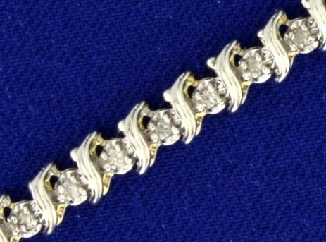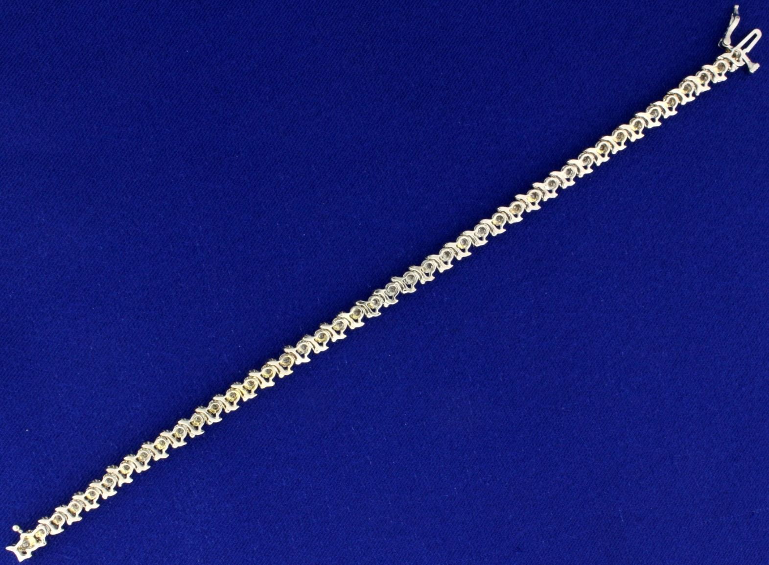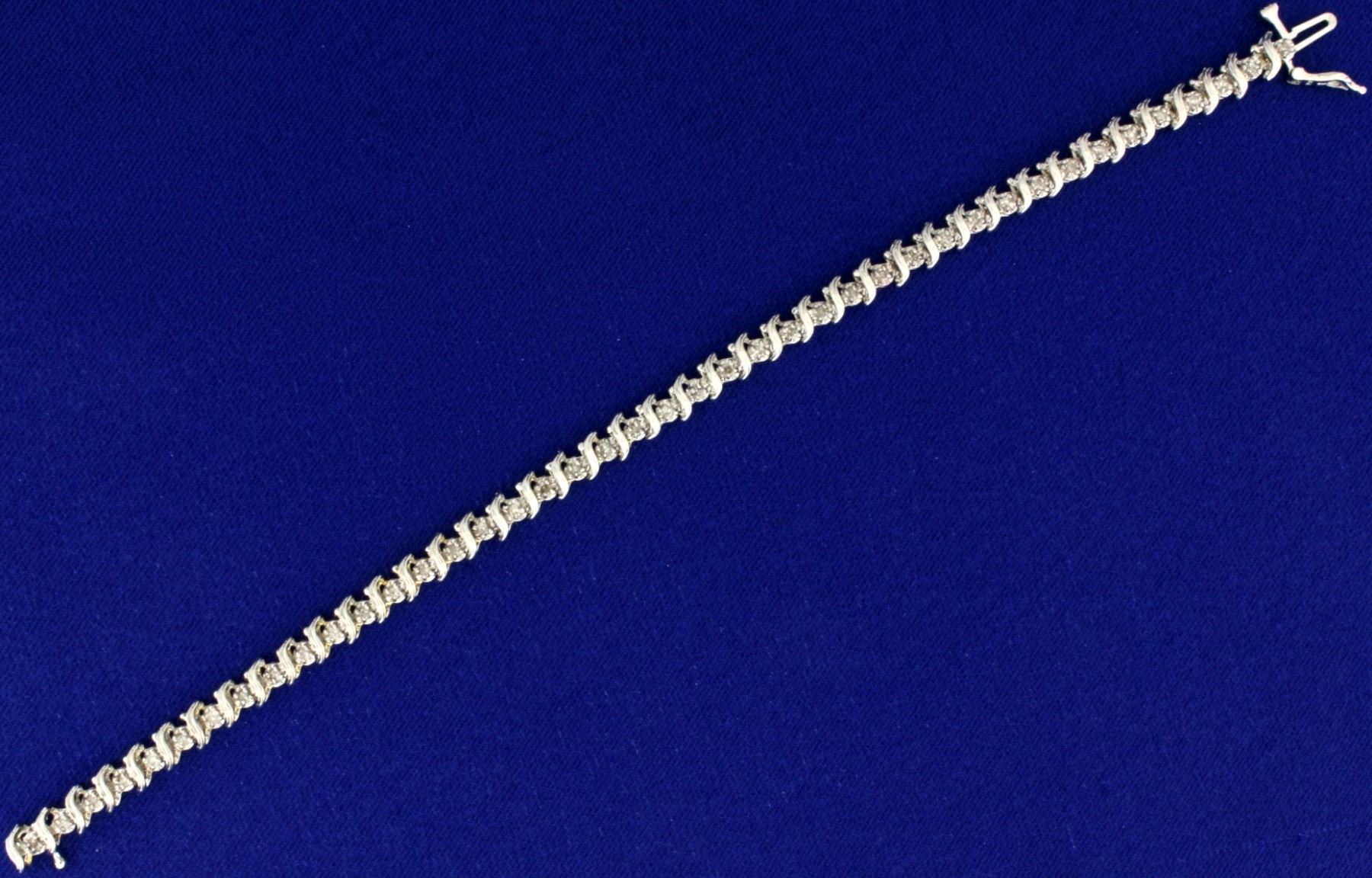 In 14k white gold. Contains 1/2 ct TW of high quality diamonds, I color/I clarity. 7 1/4" long, with safely clasp. 8.3g.