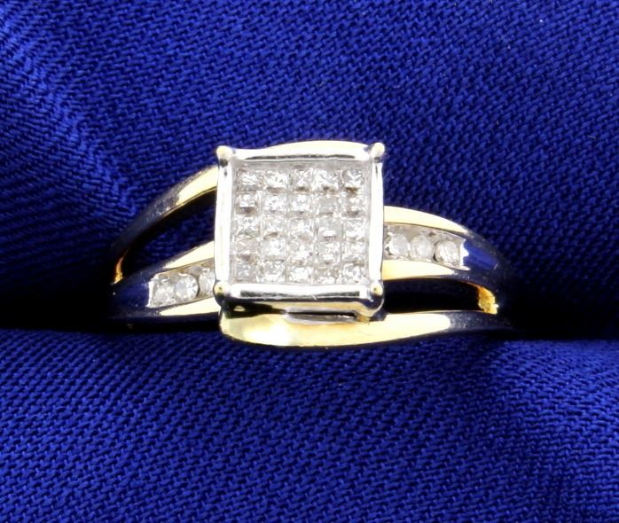 In 10k Yellow and White Gold Contains 25 high quality princess cut invisible set diamonds to form a large diamond square in center of ring. Also contains 8 round brilliant cut high quality diamonds set in the shank. 1/2 Ct TW, SI clarity/I color. Size 7. 3.4g