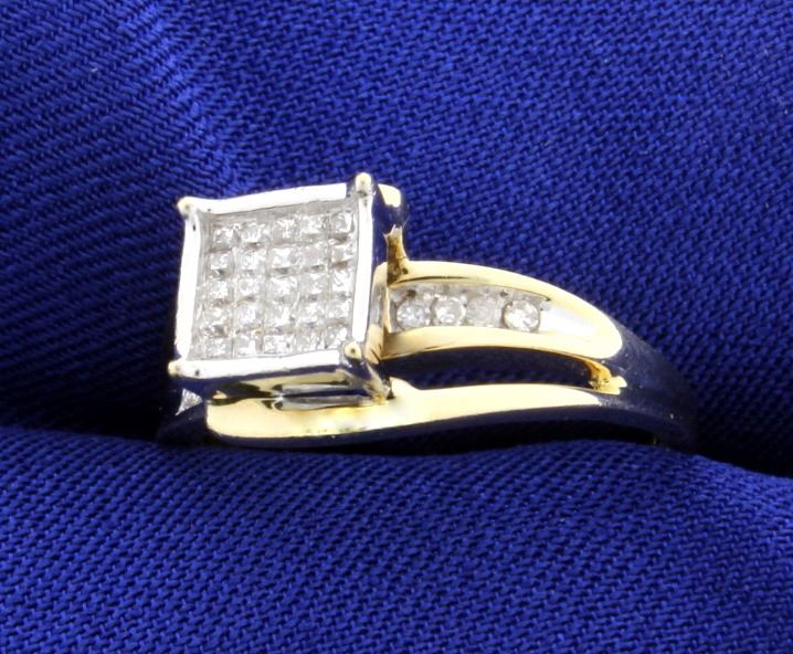 In 10k Yellow and White Gold Contains 25 high quality princess cut invisible set diamonds to form a large diamond square in center of ring. Also contains 8 round brilliant cut high quality diamonds set in the shank. 1/2 Ct TW, SI clarity/I color. Size 7. 3.4g