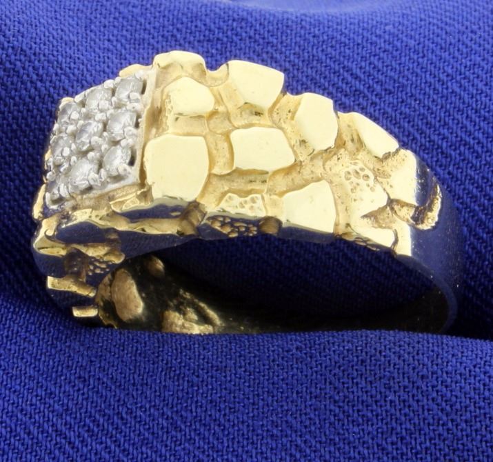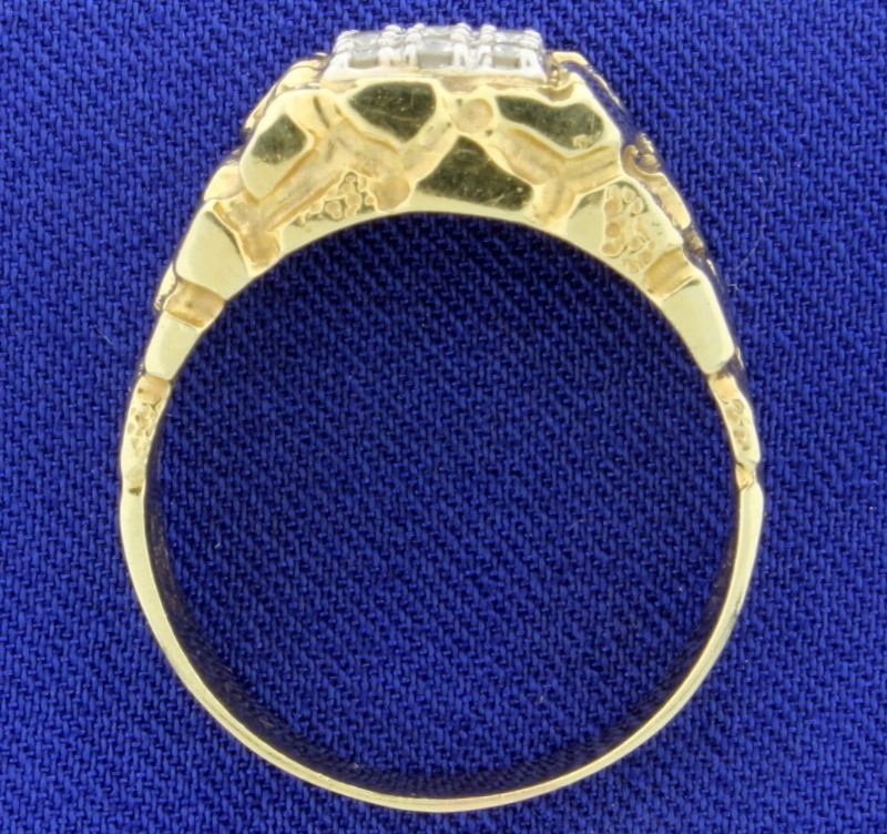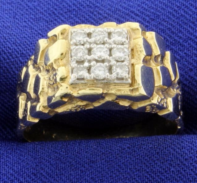 In 14K yellow gold, there are nine high quality .05ct to .06ct round diamonds VS clarity and H color. Size 10 1/2 8.1g