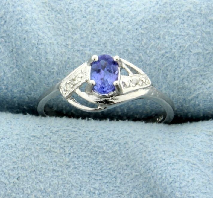 Contains 1/2 ct Genuine Tanzanite gemstone and two .01 ct Diamonds. Set in platinum over a sterling silver band. Size 7.5. 1.8g.