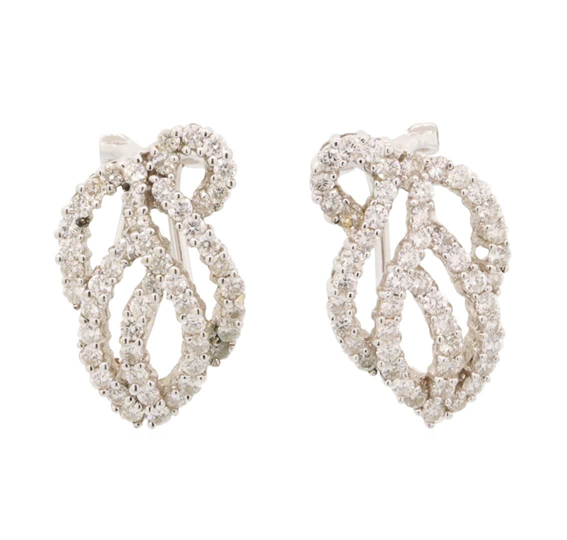 One pair electronically tested 18KT white gold lady's combination cast & assembled fashion earrings with Omega clip backs with posts with a bright polish finish. Identified with markings of '18K'. Condition is new, good workmanship. Containing: One Hundred Two prong set round brilliant cut diamonds, measuring 1.50 - 1.45 x 0.89mm (depth est.) approximate total weight of 102 Stones = 1.20ct. Graded in the setting. Color H - I Clarity SI-2 to I-1 Cut Good. Total Weight of Diamonds 1.20ct.. Total Weight of Earrings 6.40gm GAS Appraised at $3225.00. GAS Appraised.