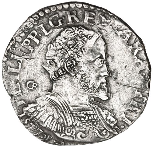 1/2 ducado. 1577. Nápoles. GR-VP junto a la fecha. Rayas. MBC-/MBC. Muy escasa.