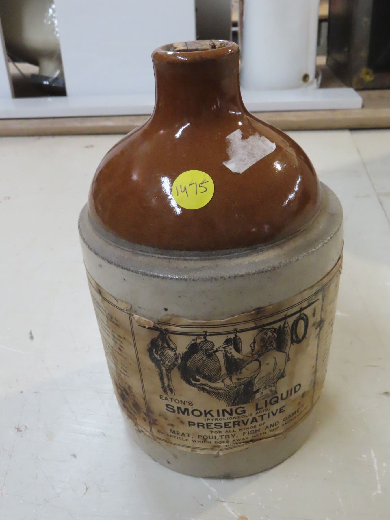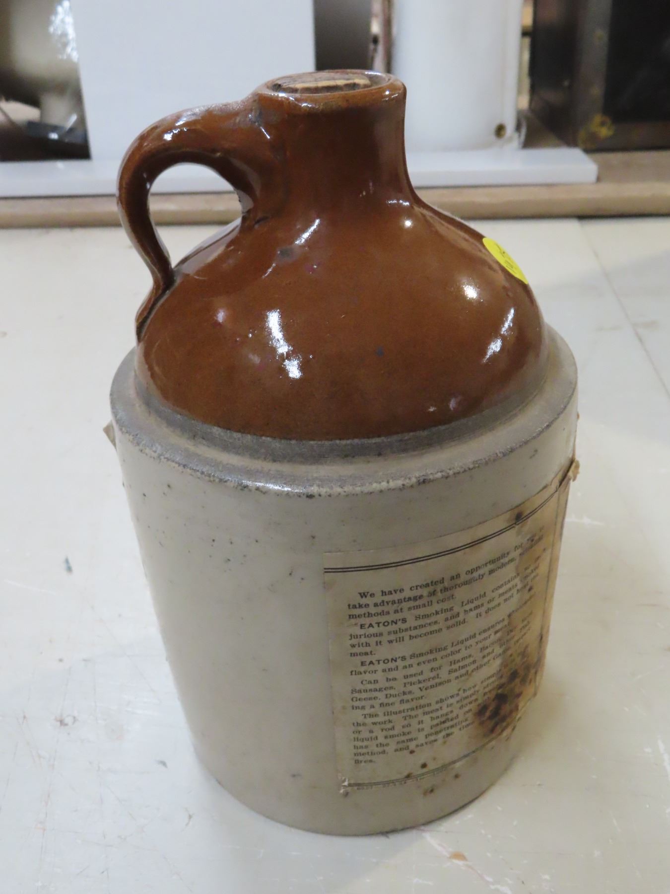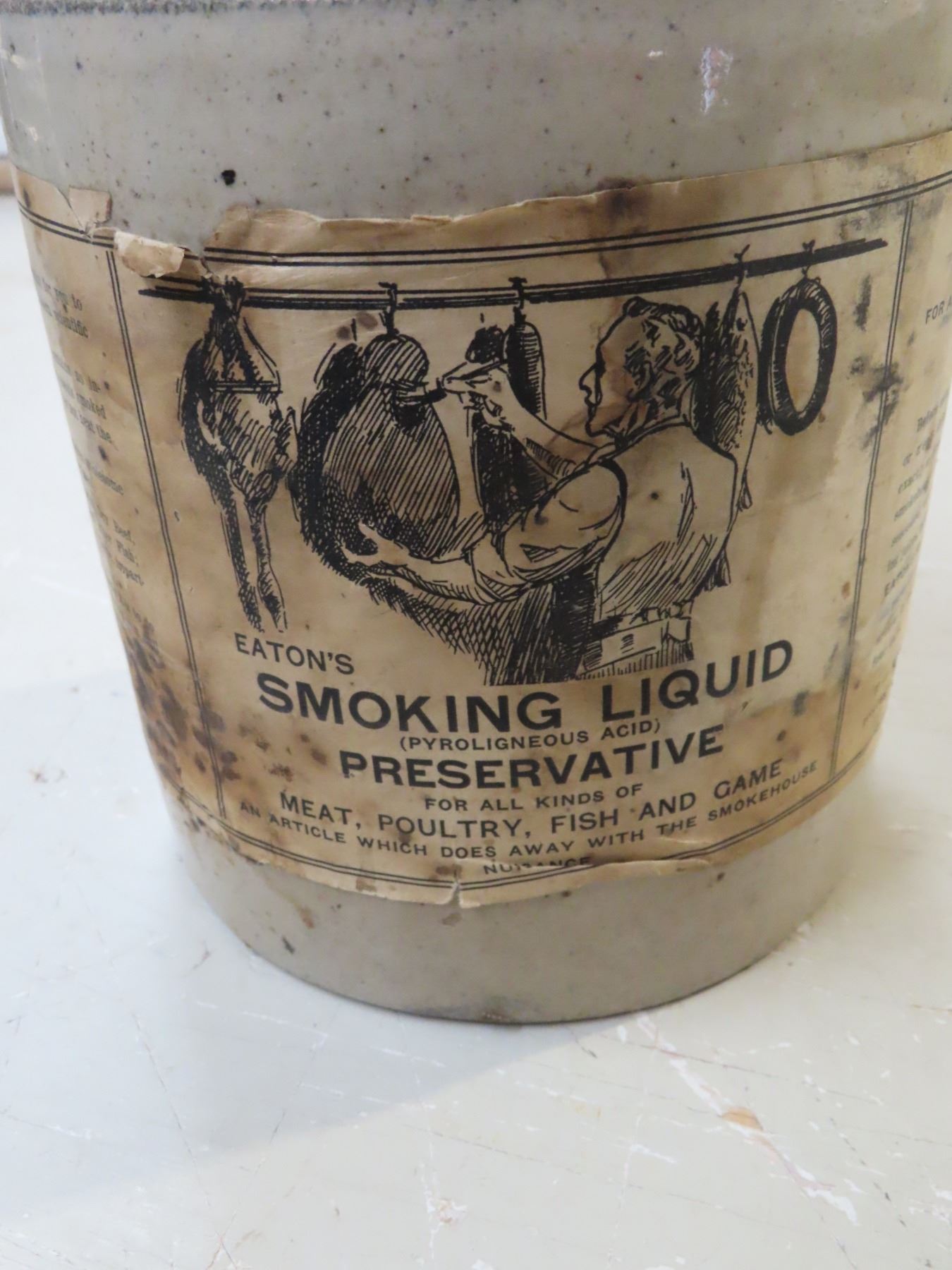 1/2 gal Medalta jug with Eatons smoking liquid label - no cracks/chips