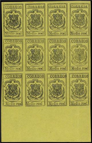 (*) 1/2 real azul s. amarillo. Bloque de 12 ejemplares. MAGNIFICO y RARO. Cert. HOLCOMBE.