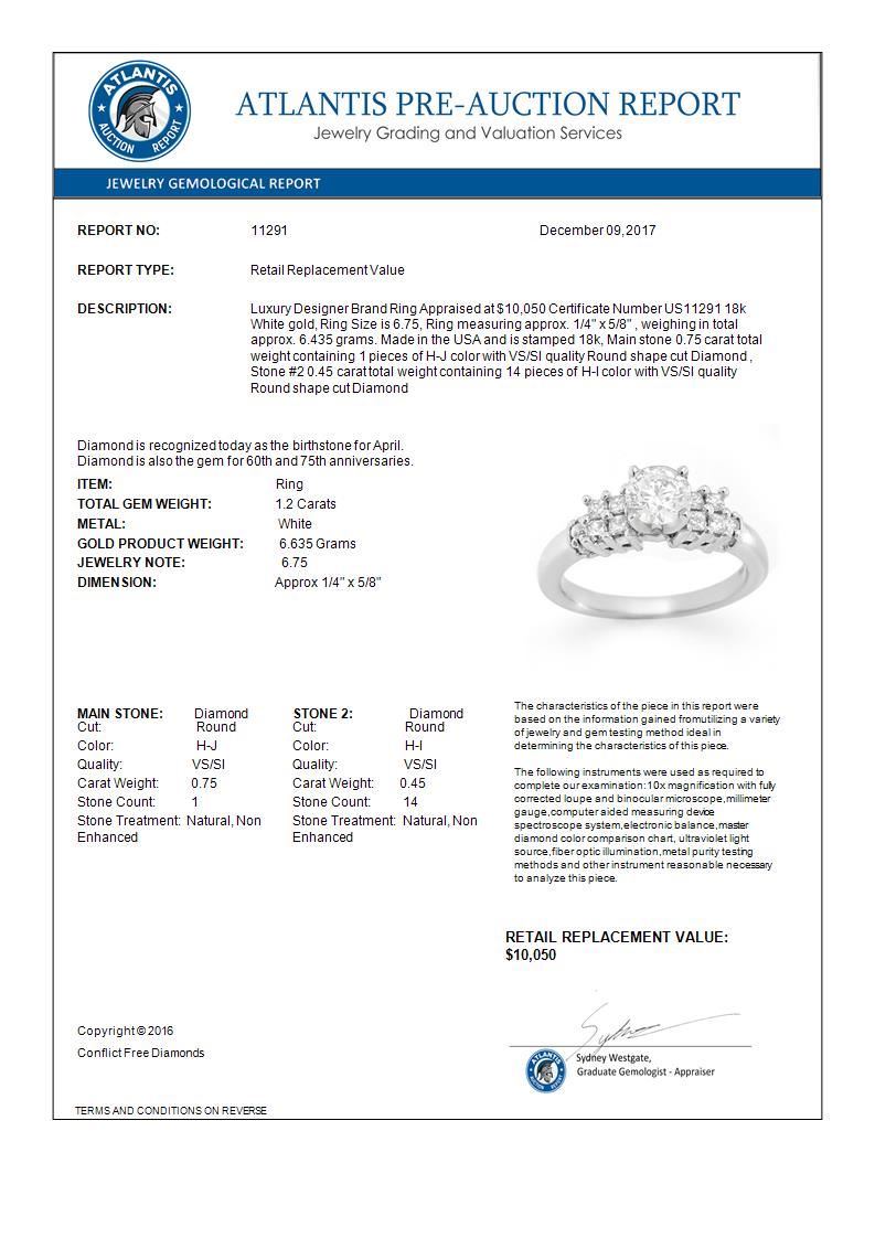 REF-228X4T -11291 ---- 1.20 CTW Certified VS/SI Diamond Solitaire Ring 18K White Gold ---- Luxury Designer Brand Ring Appraised at $10,050 Certificate Number US11291 18k White gold, Ring Size is 6.75, Ring measuring approx. 1/4" x 5/8" , weighing in total approx. 6.435 grams. Made in the USA and is stamped 18k, Main stone 0.75 carat total weight containing 1 pieces of H-J color with VS/SI quality Round shape cut Diamond , Stone #2 0.45 carat total weight containing 14 pieces of H-I color with VS/SI quality Round shape cut Diamond