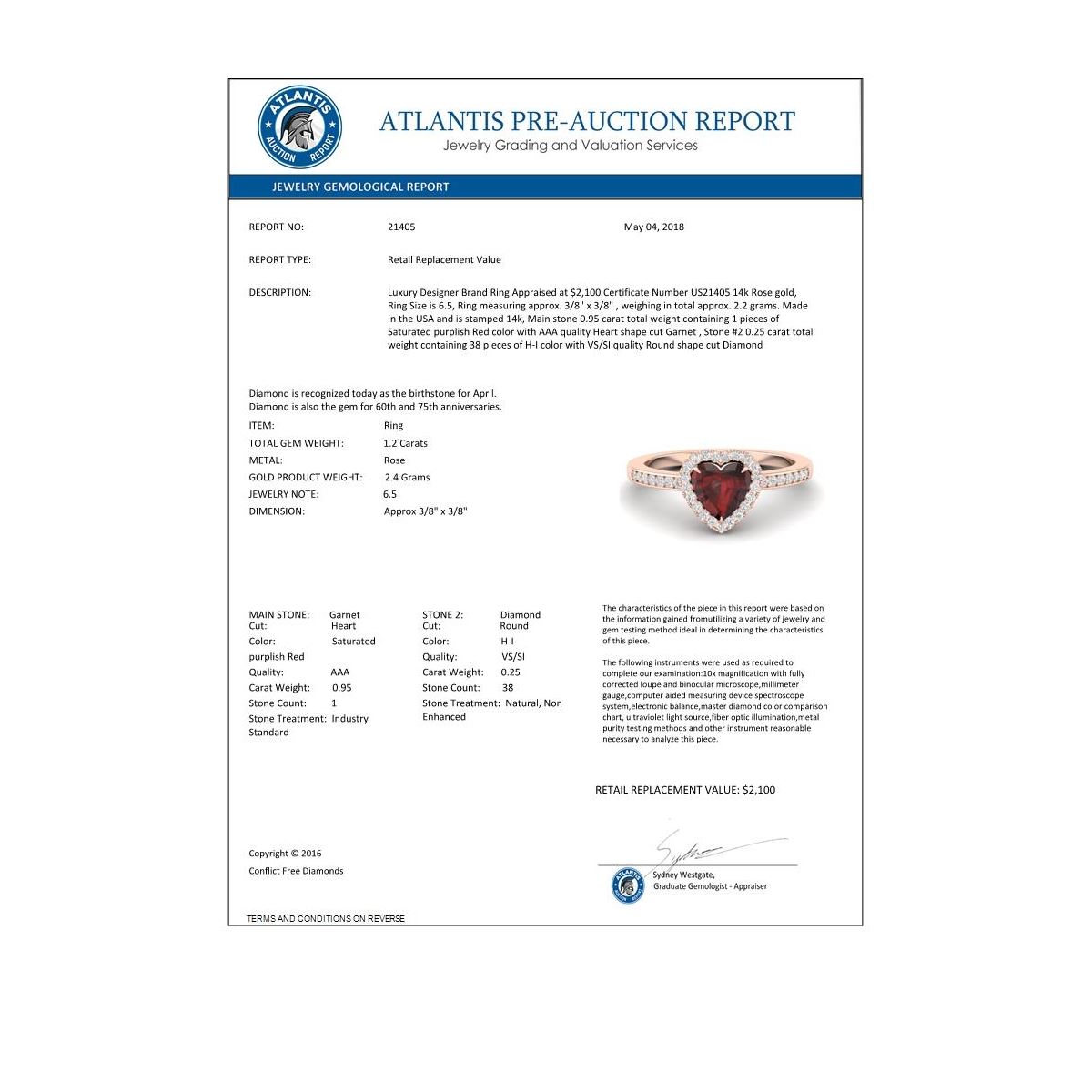 REF-35X3T -21405 ---- 1.20 CTW Garnet & Micro VS/SI Diamond Ring Heart 14K Rose Gold ---- Luxury Designer Brand Ring Appraised at $2,100 Certificate Number US21405 14k Rose gold, Ring Size is 6.5, Ring measuring approx. 3/8" x 3/8" , weighing in total approx. 2.2 grams. Made in the USA and is stamped 14k, Main stone 0.95 carat total weight containing 1 pieces of Saturated purplish Red color with AAA quality Heart shape cut Garnet , Stone #2 0.25 carat total weight containing 38 pieces of H-I color with VS/SI quality Round shape cut Diamond