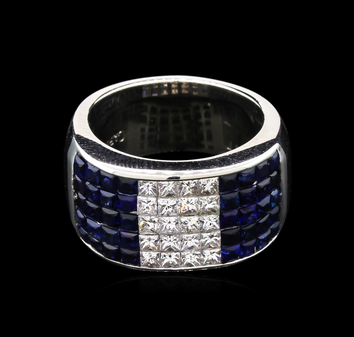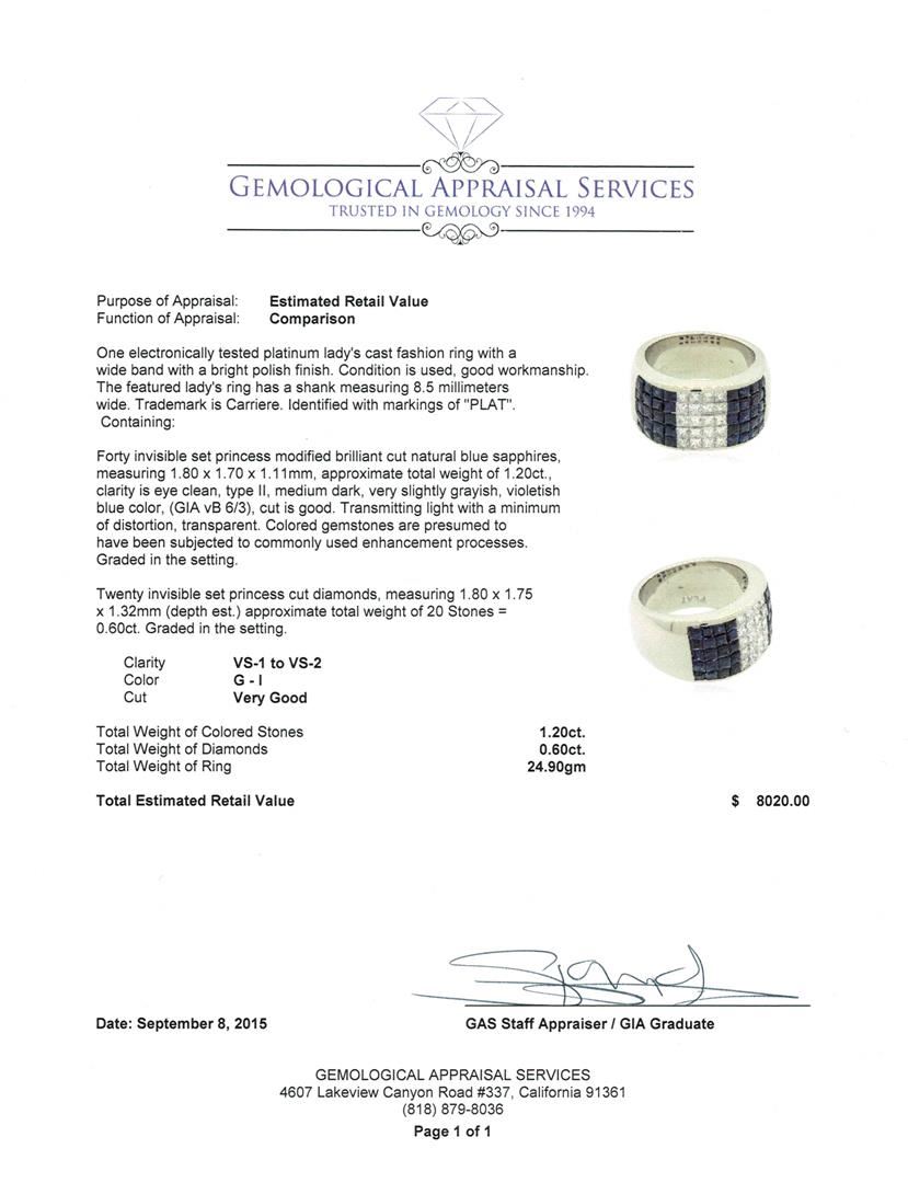 One electronically tested platinum lady's cast fashion ring with a wide band with a bright polish finish. The featured lady's ring has a shank measuring 8.5 millimeters wide. Trademark is Carriere. Identified with markings of "PLAT". Condition is used, good workmanship. Containing: Forty invisible set princess modified brilliant cut natural blue sapphires, measuring 1.80 x 1.70 x 1.11mm, approximate total weight of 1.20ct., clarity is eye clean, type II, medium dark, very slightly grayish, violetish blue color, (GIA vB 6/3), cut is good. Transmitting light with a minimum of distortion, transparent. Colored gemstones are presumed to have been subjected to commonly used enhancement processes. Graded in the setting. Twenty invisible set princess cut diamonds, measuring 1.80 x 1.75 x 1.32mm (depth est.) approximate total weight of 20 Stones = 0.60ct. Graded in the setting. Clarity: VS-1 to VS-2. Color: G - I. Cut Very Good. Total Weight of Colored Stones 1.20ct. Total Weight of Diamonds 0.60ct. Total Weight of Ring 24.90gm. GAS Appraised at $8,020.00.