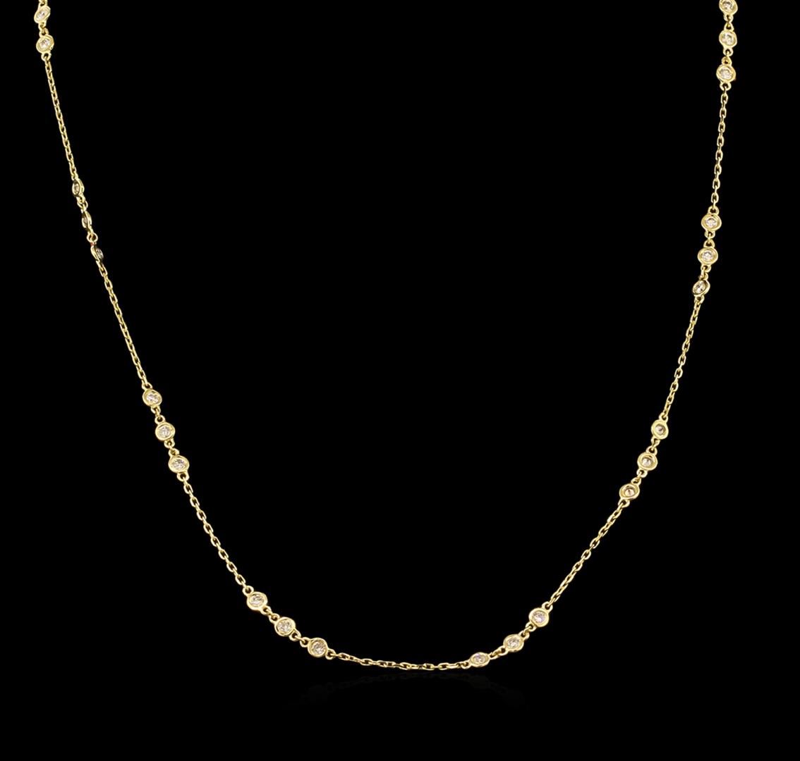 One electronically tested 14KT yellow gold ladies cast & assembled diamond station necklace. Sixteen inch length necklace features a flexible series of diamond set stations, terminating in a lobster claw clasp. Bright polish finish. Identified with markings of "K14". Condition is new, good workmanship. Containing: Thirty bezel set round brilliant cut diamonds exact total weight 30 Stones = 1.20ct. Graded in the setting. Clarity: SI-2 to I-1. Color: G - I. Total Weight of Diamonds 1.20ct. Total Weight of Necklace 3.61gm. AIG Appraised at $3,875.00.
