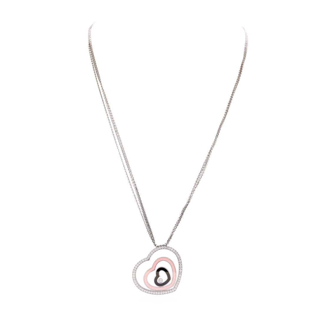 One electronically tested 18KT white gold lady's combination cast & assembled designer fashion pendant and chain 24.0' long, 1.3mm diamond cut oval cable link with a lobster claw clasp with a bright polish finish. The featured lady's pendant is from the Chopard Happy Spirit collection and has two attached 24 inch chains. The heart-shaped pendant with signed glazed compartment contains two black and pink enamel free moving open hearts and a free moving diamond collet. Pendant signed Chopard Happy Spirit, no. 6060664 79/6230/01, chain signed Chopard. Trademark is Chopard. Identified with markings of '750'. Condition is new, good workmanship. Containing: One bezel set round brilliant cut diamond, measuring 3.00 - 2.95 x 1.85mm (depth est.) approximate weight of 0.10 ct. Graded in the setting. Color F Clarity VS-1 Cut Excellent Sixty prong set round brilliant cut diamonds, measuring 1.70 - 1.70 x 1.05mm (depth est.) approximate total weight of 60 Stones = 1.10 ct. Graded in the setting. Color F - G Clarity VS-1 to VS-2 Cut Excellent. Total Weight of Diamonds 1.20 ct.. Total Weight of Pendant And Chain 38.50gm GAS Appraised at $6805.00. GAS Appraised.