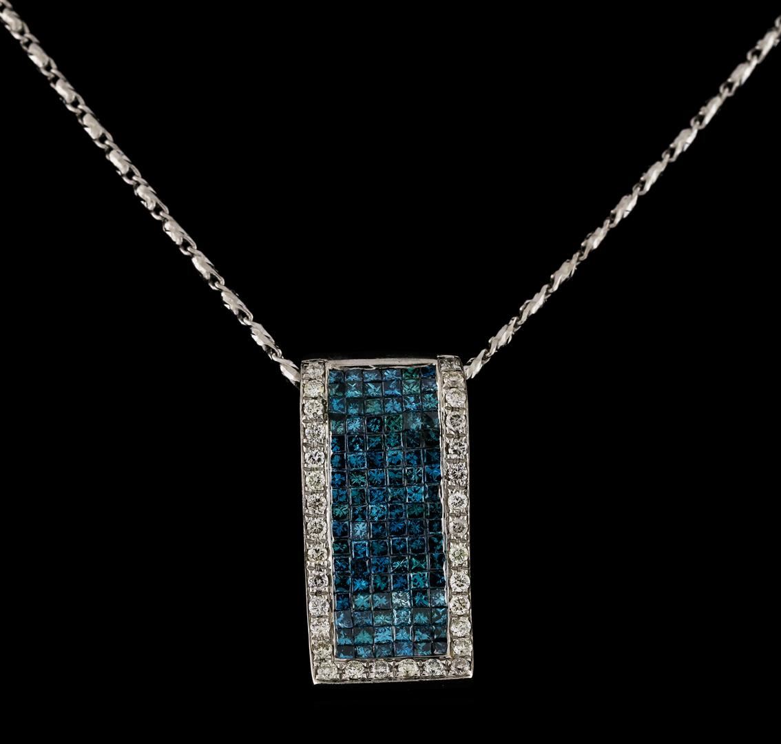 One electronically tested 18KT white gold lady's combination cast & assembled fashion pendant & chain 16.0' long, 1.2mm diamond cut link with a lobster claw clasp with a bright polish finish. Identified with markings of '18K'. Condition is new, good workmanship. Containing: One Hundred Two invisible set princess cut diamonds, measuring 1.15 x 1.10 x 0.83mm (depth est.) approximate total weight of 102 Stones = 0.90ct. Colored gemstones are presumed to have been subjected to commonly used enhancement processes. Graded in the setting. Clarity VS-2 to SI-1 Cut Very Good Thirty-Two bead set round brilliant cut diamonds, measuring 1.40 - 1.30 x 0.84mm (depth est.) approximate total weight of 32 Stones = 0.30ct. Graded in the setting. Clarity SI-1 to I-1. Color: H - I Cut Good. Total Weight of Diamonds 1.20ct.. Total Weight of Pendant & Chain 8.20gm. GAS Appraised at $5,765.00.