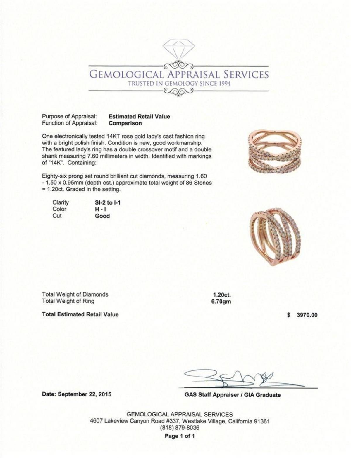 One electronically tested 14KT rose gold lady's cast fashion ring with a bright polish finish. The featured lady's ring has a double crossover motif and a double shank measuring 7.60 millimeters in width. Identified with markings of "14K". Condition is new, good workmanship. Containing: Eighty-Six prong set round brilliant cut diamonds, measuring 1.60 - 1.50 x 0.95mm (depth est.) approximate total weight of 86 Stones = 1.20ct. Graded in the setting. Clarity: SI-2 to I-1. Color: H - I. Cut Good. Total Weight of Diamonds 1.20ct. Total Weight of Ring 6.70gm at $3970.00.. GAS Appraised.
