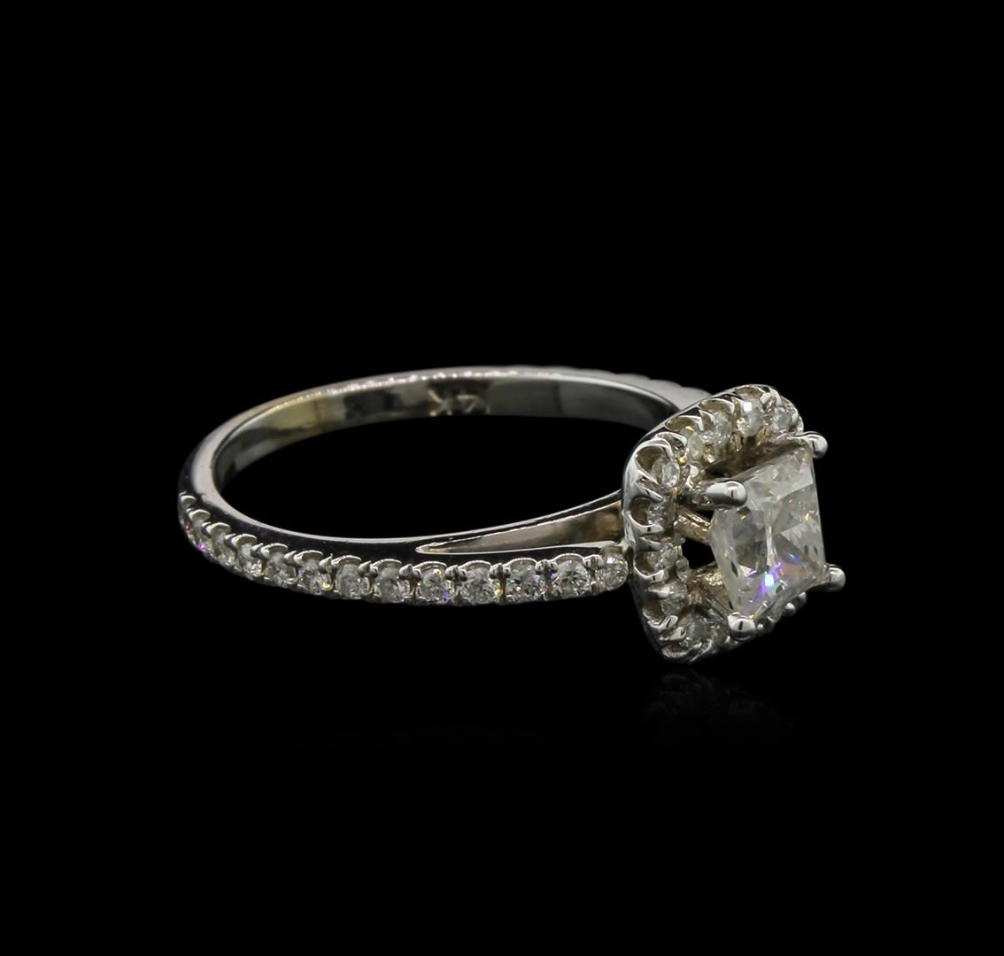 One electronically tested 14KT white gold lady's cast engagement ring with a cathedral shank with a bright polish finish. The featured engagement ring has a halo motif with a 1.75 millimeter wide shank. Identified with markings of "14K". Condition is new, good workmanship. Containing: One prong set princess cut diamond, measuring 4.98 x 4.72 x 3.78mm (depth est.) , 10.00.%. GTCF approximate weight of 0.80ct. Graded in the setting. Clarity: I-1. Color: Good Forty split prong set round brilliant cut diamonds, measuring 1.40 - 1.35 x 0.90mm (depth est.) approximate. Total Weight of 40 Stones = 0.40ct. Graded in the setting. Clarity: SI-2 to I-1. Color: G - I. Cut Good. Total Weight of Diamonds 1.20ct. Total Weight of Ring 3.20gm. GAS Appraised at $7,195.00.