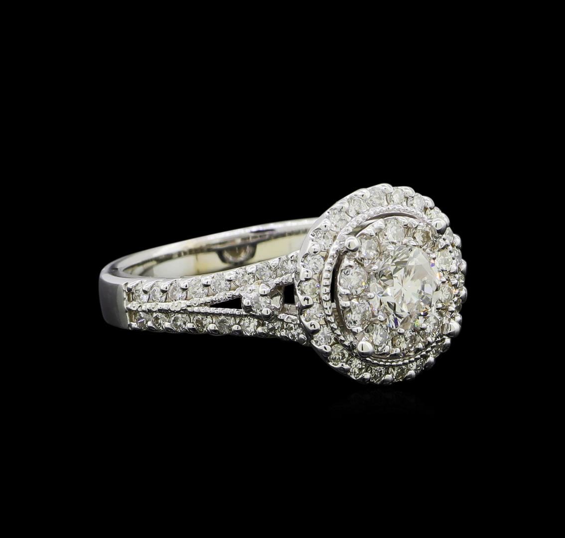 One electronically tested 14KT white gold lady's cast wedding ring with a double halo with a bright polish with milgrain detailing finish. The featured lady's ring has a shank measuring 2.63 millimeters wide. Identified with markings of '585'. Condition is new, good workmanship. Containing: One prong set round brilliant cut diamond, measuring 5.15 - 5.12 x 3.21mm (depth est.) approximate weight of 0.51ct. Graded in the setting. Clarity I-1. Color: F - G Cut Very Good Ten prong set round brilliant cut diamonds, measuring 1.90 - 1.80 x 1.11mm (depth est.) approximate total weight of 10 Stones = 0.23ct. Graded in the setting. Clarity VS-2 to SI-2. Color: G - H Cut Good Fifty-Six prong set round brilliant cut diamonds, measuring 1.35 - 1.25 x 0.79mm (depth est.) approximate total weight of 56 Stones = 0.46ct. Graded in the setting. Clarity SI-1 to I-1. Color: H - I Cut Good. Total Weight of Diamonds 1.20ct.. Total Weight of Ring 5.00gm. GAS Appraised at $6,240.00.
