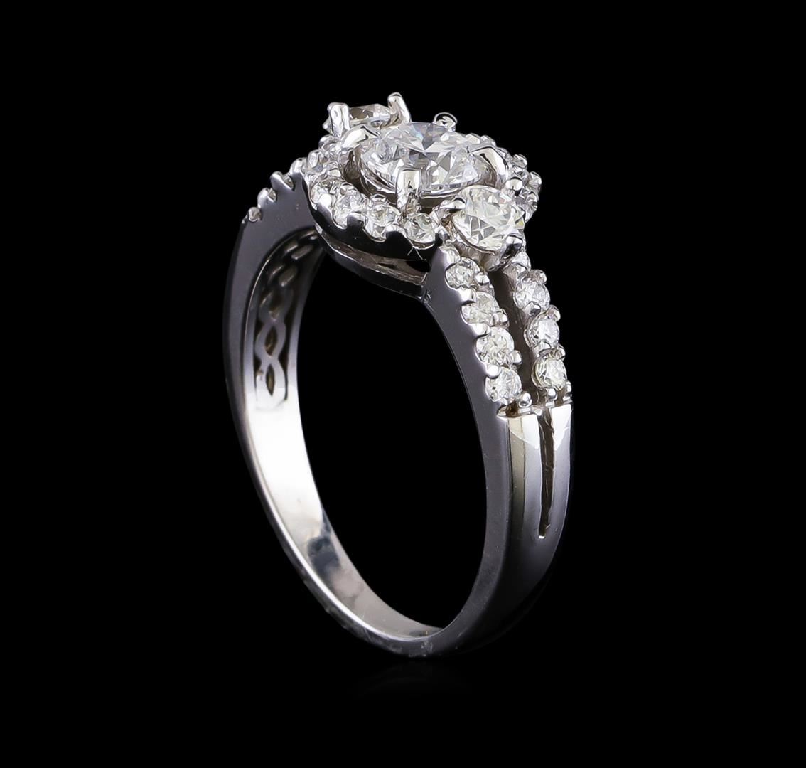 One electronically tested 14KT white gold lady's cast wedding ring split shank halo with a bright polish finish. The featured lady's ring has a shank measuring 2.13 millimeters in width. Identified with markings of "14K". Condition is new, good workmanship. Containing: One prong set round brilliant cut diamond, measuring 5.21 - 5.13 x 3.15mm (depth est.) approximate weight of 0.53ct. Graded in the setting. Clarity: SI-2. Color: Very Good Two prong set round brilliant cut diamonds, measuring 3.15 - 3.10 x 1.94mm (depth est.) approximate total weight of 2 Stones = 0.25ct. Graded in the setting. Clarity: VS-2 to SI-1. Color: H - I. Cut Very Good Twenty-Eight prong set round brilliant cut diamonds, measuring 1.60 - 1.50 x 0.96mm (depth est.) approximate total weight of 28 Stones = 0.42ct. Graded in the setting. Clarity: SI-1 to SI-2. Color: G - Good. Total Weight of Diamonds 1.20ct. Total Weight of Split Shank Halo 3.50gm. GAS Appraised at $6,185.00.