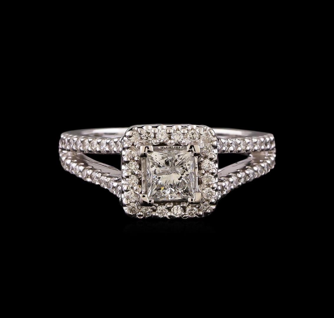 One electronically tested 14KT white gold lady's cast wedding ring with a split shank halo with a bright polish finish. The featured lady's ring has a shank measuring 1.94 millimeters wide. Identified with markings of '14K'. Condition is new, good workmanship. Containing: One prong set princess cut diamond, measuring 4.71 x 4.55 x 3.70mm (depth est.) , 10.00.%. GTCF approximate weight of 0.72ct. Graded in the setting. Clarity I-1. Color: G - H Cut Good Sixty prong set round brilliant cut diamonds, measuring 1.30 - 1.25 x 0.79mm (depth est.) approximate total weight of 60 Stones = 0.48ct. Graded in the setting. Clarity SI-1 to SI-2. Color: G - H Cut Good. Total Weight of Diamonds 1.20ct.. Total Weight of Ring 5.70gm. GAS Appraised at $6,775.00.