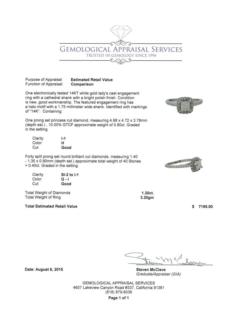 One electronically tested 14KT white gold lady's cast engagement ring with a cathedral shank with a bright polish finish. The featured engagement ring has a halo motif with a 1.75 millimeter wide shank. Identified with markings of "14K". Condition is new, good workmanship. Containing: One prong set princess cut diamond, measuring 4.98 x 4.72 x 3.78mm (depth est.) , 10.00.%. GTCF approximate weight of 0.80ct. Graded in the setting. Clarity: I-1. Color: Good Forty split prong set round brilliant cut diamonds, measuring 1.40 - 1.35 x 0.90mm (depth est.) approximate. Total Weight of 40 Stones = 0.40ct. Graded in the setting. Clarity: SI-2 to I-1. Color: G - I. Cut Good. Total Weight of Diamonds 1.20ct. Total Weight of Ring 3.20gm. GAS Appraised at $7,195.00.