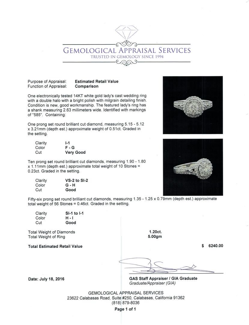 One electronically tested 14KT white gold lady's cast wedding ring with a double halo with a bright polish with milgrain detailing finish. The featured lady's ring has a shank measuring 2.63 millimeters wide. Identified with markings of '585'. Condition is new, good workmanship. Containing: One prong set round brilliant cut diamond, measuring 5.15 - 5.12 x 3.21mm (depth est.) approximate weight of 0.51ct. Graded in the setting. Clarity I-1. Color: F - G Cut Very Good Ten prong set round brilliant cut diamonds, measuring 1.90 - 1.80 x 1.11mm (depth est.) approximate total weight of 10 Stones = 0.23ct. Graded in the setting. Clarity VS-2 to SI-2. Color: G - H Cut Good Fifty-Six prong set round brilliant cut diamonds, measuring 1.35 - 1.25 x 0.79mm (depth est.) approximate total weight of 56 Stones = 0.46ct. Graded in the setting. Clarity SI-1 to I-1. Color: H - I Cut Good. Total Weight of Diamonds 1.20ct.. Total Weight of Ring 5.00gm. GAS Appraised at $6,240.00.