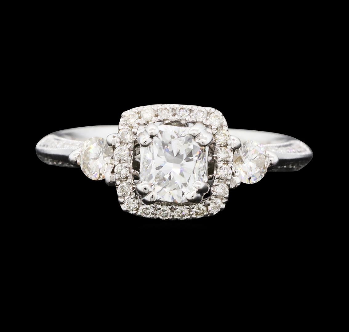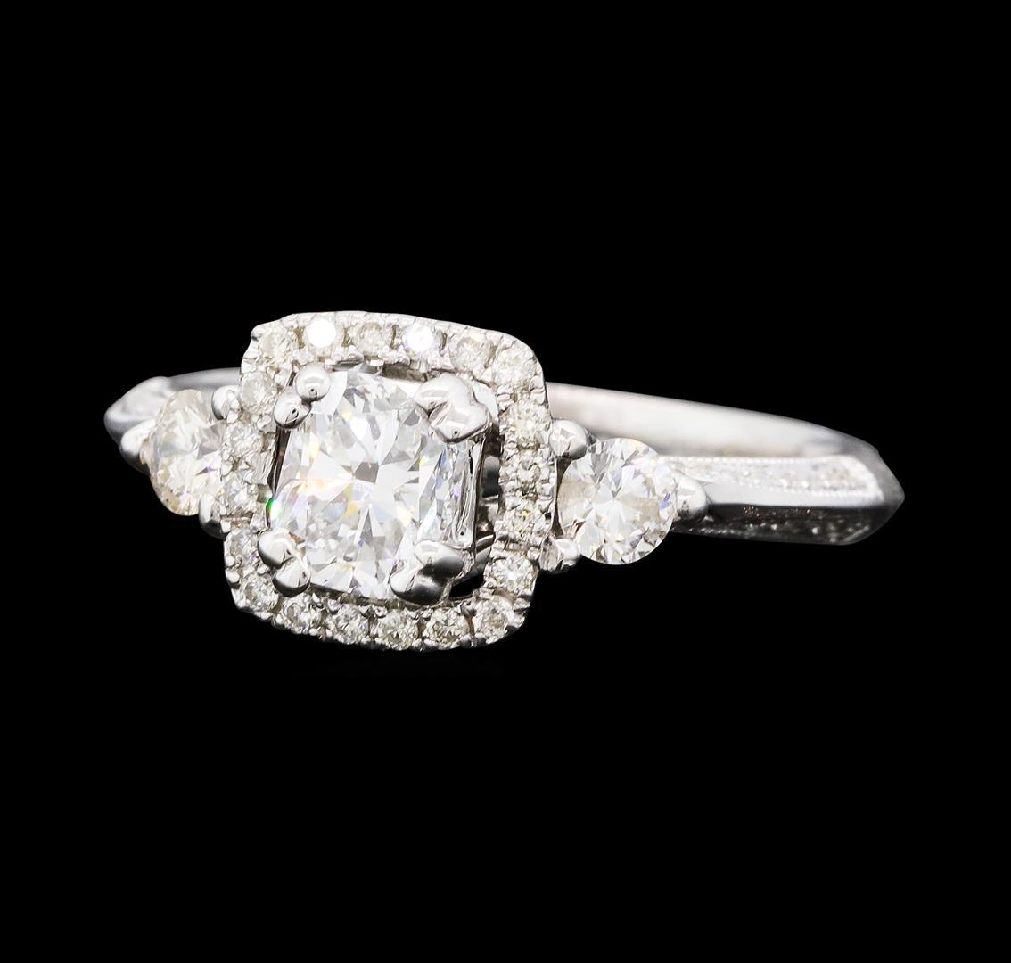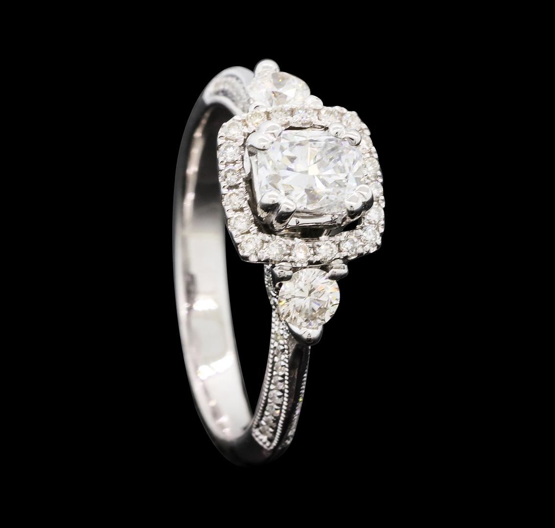One electronically tested 14KT white gold lady's cast wedding ring with a knife edge cathedral shank with a bright polish with milgrain detailing finish. The featured lady's ring has a halo and a shank measuring 2.66 millimeters wide. Identified with markings of '14K'. Condition is new, good workmanship. Containing: One prong set cushion cut diamond, measuring 5.46 x 4.50 x 3.10mm (depth est.) , 8.00.%. GTCF approximate weight of 0.70ct. Graded in the setting. Color G Clarity SI-1 Cut Very Good Two prong set round brilliant cut diamonds, measuring 3.20 - 3.10 x 1.89mm (depth est.) approximate total weight of 2 Stones = 0.22ct. Graded in the setting. Color H - I Clarity SI-1 to I-1 Cut Good Seventy-Eight prong set round brilliant cut diamonds, measuring 1.10 - 0.90 x 0.60mm (depth est.) approximate total weight of 78 Stones = 0.28ct. Graded in the setting. Color H - I Clarity SI-1 to I-1 Cut Good. Total Weight of Diamonds 1.20ct.. Total Weight of Ring 3.80gm GAS Appraised at $9,295.00.
