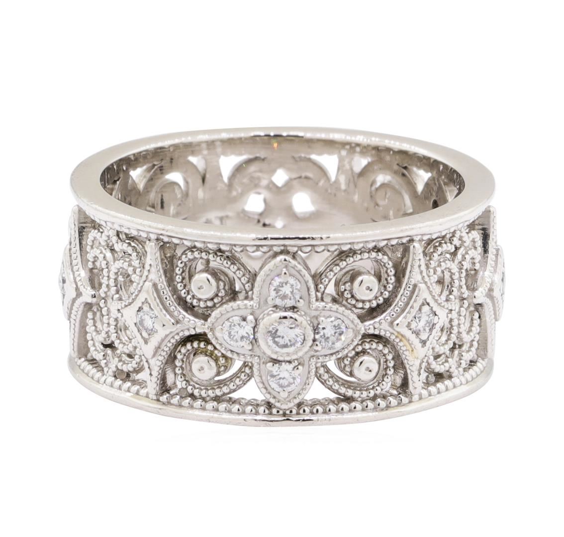 One electronically tested 14KT white gold lady's cast wedding ring with a bypass shank with a halo with a bright polish finish. The featured lady's ring has a shank measuring 2.70 millimeters wide. Identified with markings of '14K'. Condition is new, good workmanship. Containing: One prong set round brilliant cut diamond, measuring 5.35 - 5.28 x 3.30mm (depth est.) approximate weight of 0.57ct. Graded in the setting. Color I - J Clarity I-1 Cut Good Twenty-Eight channel set round brilliant cut diamonds, measuring 1.70 - 1.50 x 0.99mm (depth est.) approximate total weight of 28 Stones = 0.45ct. Graded in the setting. Color H - I Clarity SI-1 to I-1 Cut Good Forty prong set round brilliant cut diamonds, measuring 1.10 - 1.00 x 0.65mm (depth est.) approximate total weight of 40 Stones = 0.18ct. Graded in the setting. Color H - I Clarity SI-1 to I-1 Cut Good. Total Weight of Diamonds 1.20ct.. Total Weight of Ring 4.40gm GAS Appraised at $4525.00. GAS Appraised at $4,525.00.