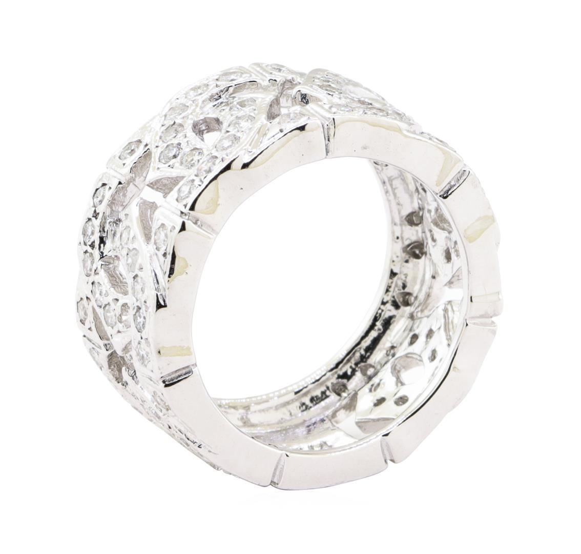 One electronically tested 14KT white gold lady's cast fashion ring with a wide band with a bright polish with milgrain detailing finish. The featured lady's ring has a shank measuring 11.08 millimeters wide. Identified with markings of '14K'. Condition is Good. Containing: Eighty-Four prong set round brilliant cut diamonds, measuring 1.60 - 1.50 x 0.96mm (depth est.) approximate total weight of 84 Stones = 1.20ct. Graded in the setting. One diamond is chipped. Color H - I Clarity SI-2 to I-1 Cut Good. Total Weight of Diamonds 1.20ct.. Total Weight of Ring 9.40gm GAS Appraised at $4280.00. GAS Appraised at $4,280.00.