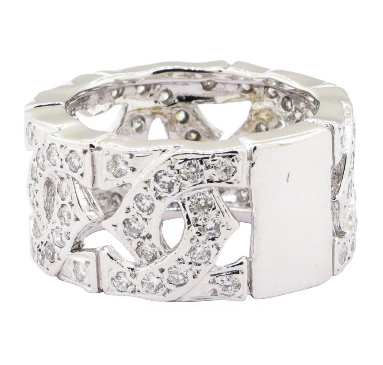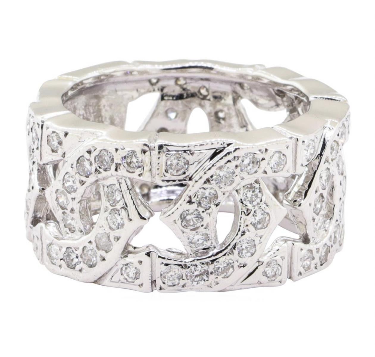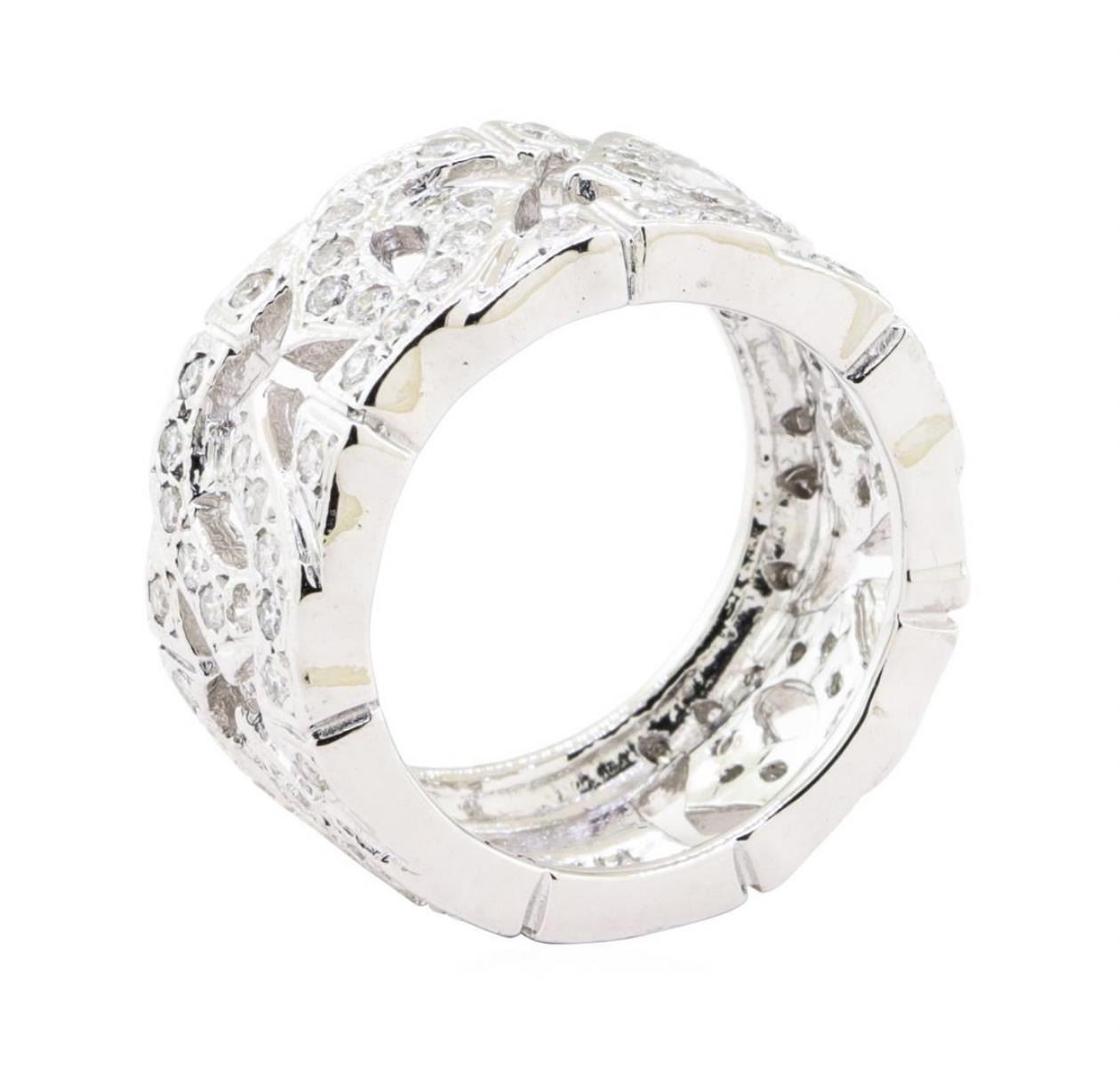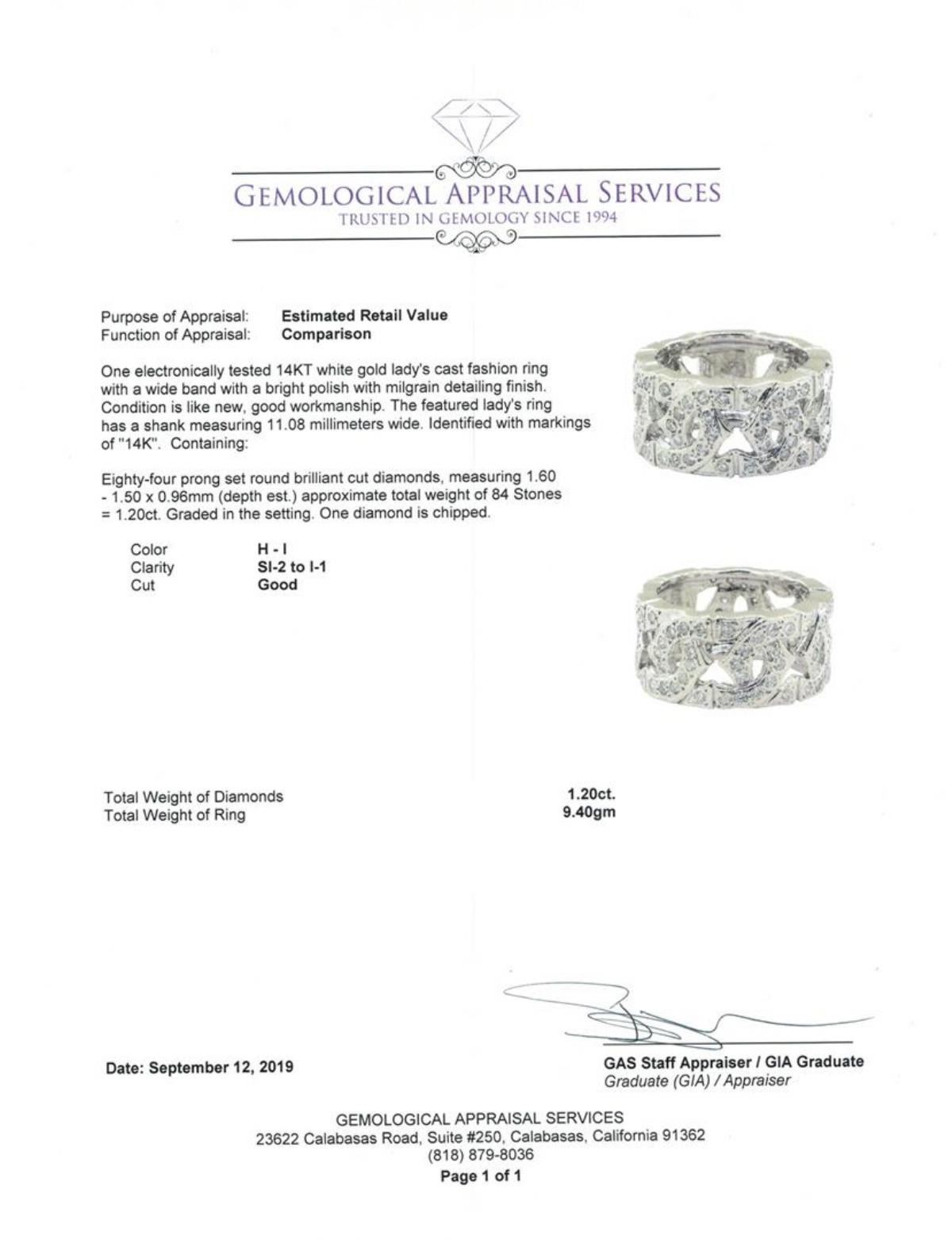 One electronically tested 14KT white gold lady's cast fashion ring with a wide band with a bright polish with milgrain detailing finish. The featured lady's ring has a shank measuring 11.08 millimeters wide. Identified with markings of '14K'. Condition is Good. Containing: Eighty-Four prong set round brilliant cut diamonds, measuring 1.60 - 1.50 x 0.96mm (depth est.) approximate total weight of 84 Stones = 1.20ct. Graded in the setting. One diamond is chipped. Color H - I Clarity SI-2 to I-1 Cut Good. Total Weight of Diamonds 1.20ct.. Total Weight of Ring 9.40gm GAS Appraised at $4280.00. GAS Appraised.