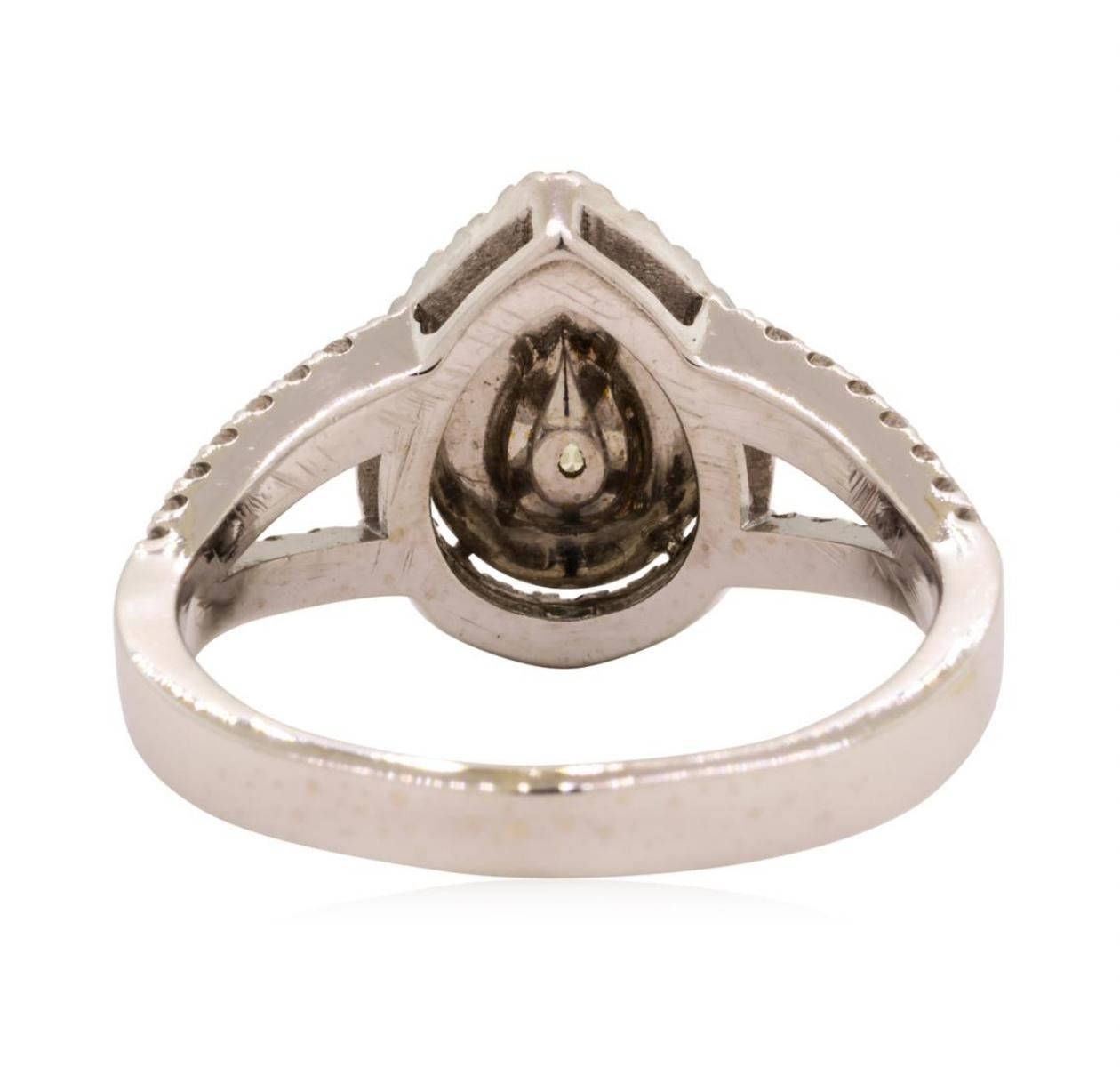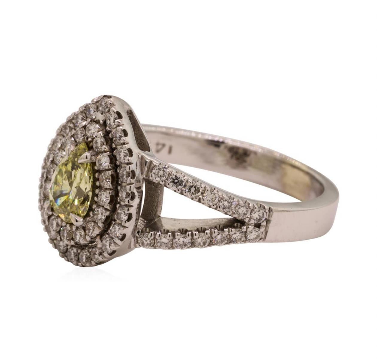 One electronically tested 14KT white gold lady's cast fashion ring with a split shank double basket halo with a bright polish finish. The featured lady's ring has a shank measuring 2.85 millimeters wide. Identified with markings of '14K'. Condition is new, good workmanship. Containing: One pear shaped cut diamond, measuring 6.60 x 4.57 x 2.88mm (depth est.) approximate weight of 0.52ct. Graded in the setting. Color Fancy Yellow Clarity SI-2 Sixty-Six prong set round brilliant cut diamonds, measuring 1.45 - 1.40 x 0.86mm (depth est.) approximate total weight of 66 Stones = 0.68ct. Graded in the setting. Color H - I Clarity SI-1 to SI-2 Cut Good. Total Weight of Diamonds 1.20ct.. Total Weight of Ring 6.00gm GAS Appraised at $5500.00. GAS Appraised.