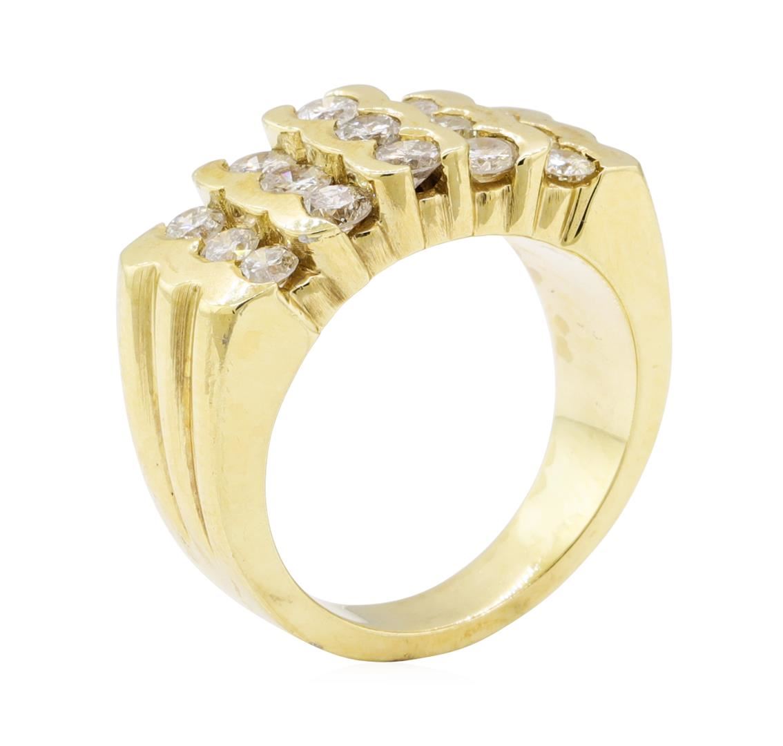 One electronically tested 14KT white gold lady's cast fashion ring with a staggered three row wide band with a bright polish finish. The featured lady's ring has a shank measuring 4.00 millimeters wide. Identified with markings of '14K'. Condition is like new, good workmanship. Containing: Fifteen half bezel set round brilliant cut diamonds, measuring 3.00 - 2.60 x 1.68mm (depth est.) approximate total weight of 15 Stones = 1.20ct. Graded in the setting. Color H - J Clarity I-1 to I-2 Cut Good. Total Weight of Diamonds 1.20ct.. Total Weight of Ring 13.10gm GAS Appraised at $4055.00. GAS Appraised.